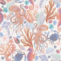 Dyk ned i ro med dette fortryllende tapet. Pastelfarver maler en drømmende undervandsscene med legende blæksprutte, yndefulde vandmænd og charmerende søheste midt i livlige koraller og muslingeskaller. Den delikate akvarelstil fremkalder en følelse af rolig og kyst charme, perfekt til at skabe en rolig og finurlig atmosfære i ethvert rum. Dette design blander havets skønhed med en hyggelig kabine æstetik, hvilket gør det ideelt til soveværelser, stuer eller hjemmekontorer, der søger et strejf af magi ved havet. De komplicerede detaljer og bløde farvepalet skaber en fængslende og fredelig visuel oplevelse.