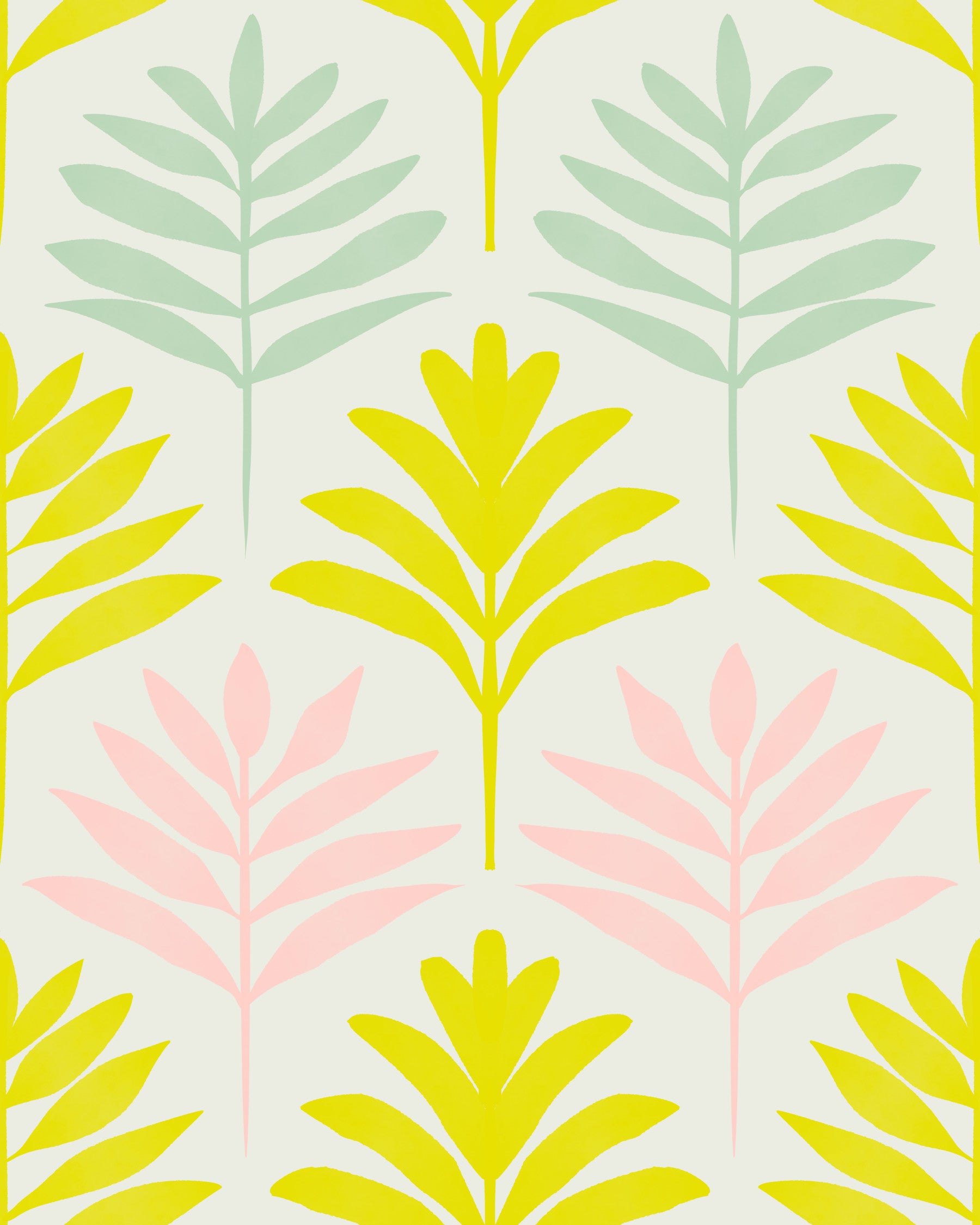 Undslippe til en rolig oase med dette dejlige tapet. Bløde pastelfarver af lyserøde, gule og myntgrønne skaber en beroligende atmosfære, mens det stiliserede botaniske mønster fremkalder en følelse af rolig natur. Det gentagne motiv af forenklede blade og grene tilføjer et strejf af legende sofistikering, hvilket gør det perfekt til soveværelser, planteskoler eller ethvert rum, der higer efter en blid og opløftende atmosfære. Dette tapet's minimalistiske, men alligevel charmerende design, tilfører ethvert rum med en følelse af fred og ubesværet stil, hvilket giver et visuelt behageligt baggrund for dine personlige berøringer.