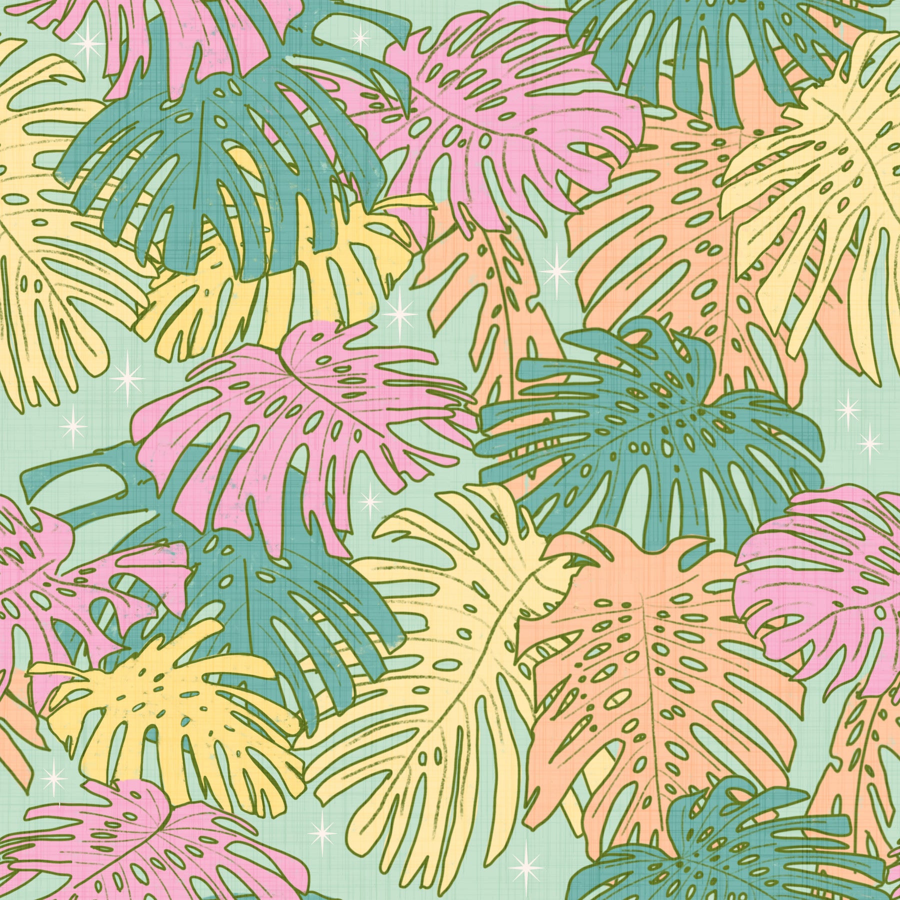 Aqua and pastel green Monstera leaf wallpaper with vintage Palm Springs style.