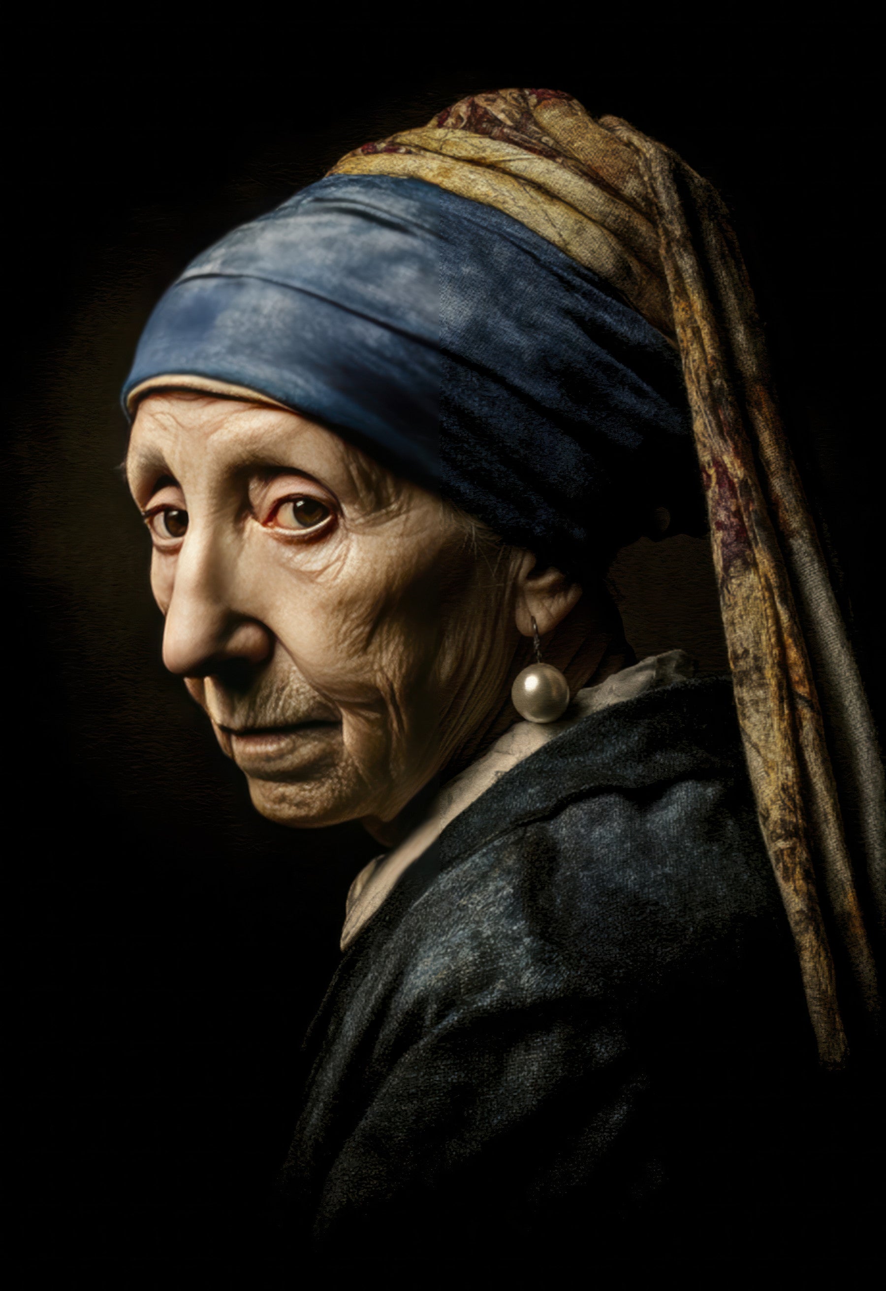 Denne tapet, der er en moderne fortolkning af Vermeer's klassiker, præsenterer en slående kontrast mellem ungdom og alder. Den velkendte blå hovedtørklæde og perleørering pryder en kvinde, der er præget af tidens gang, men alligevel forbliver hendes blik fængslende. De dybe skygger og rige strukturer fremkalder en følelse af mysterium og intriger. Dette er et kunstnerisk udsagnsstykke, der tilføjer et strejf af raffinement og tidløs elegance til ethvert rum. Det er perfekt til kunstelskere, der nyder en unik blanding af tradition og moderne æstetik.