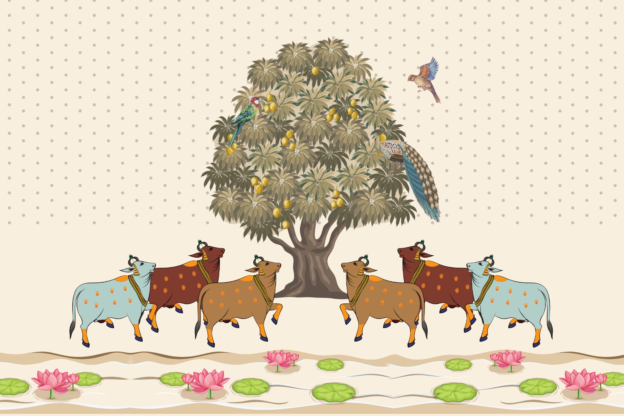 Pichwai Sacred Cows Mango Tree Mural elegant design