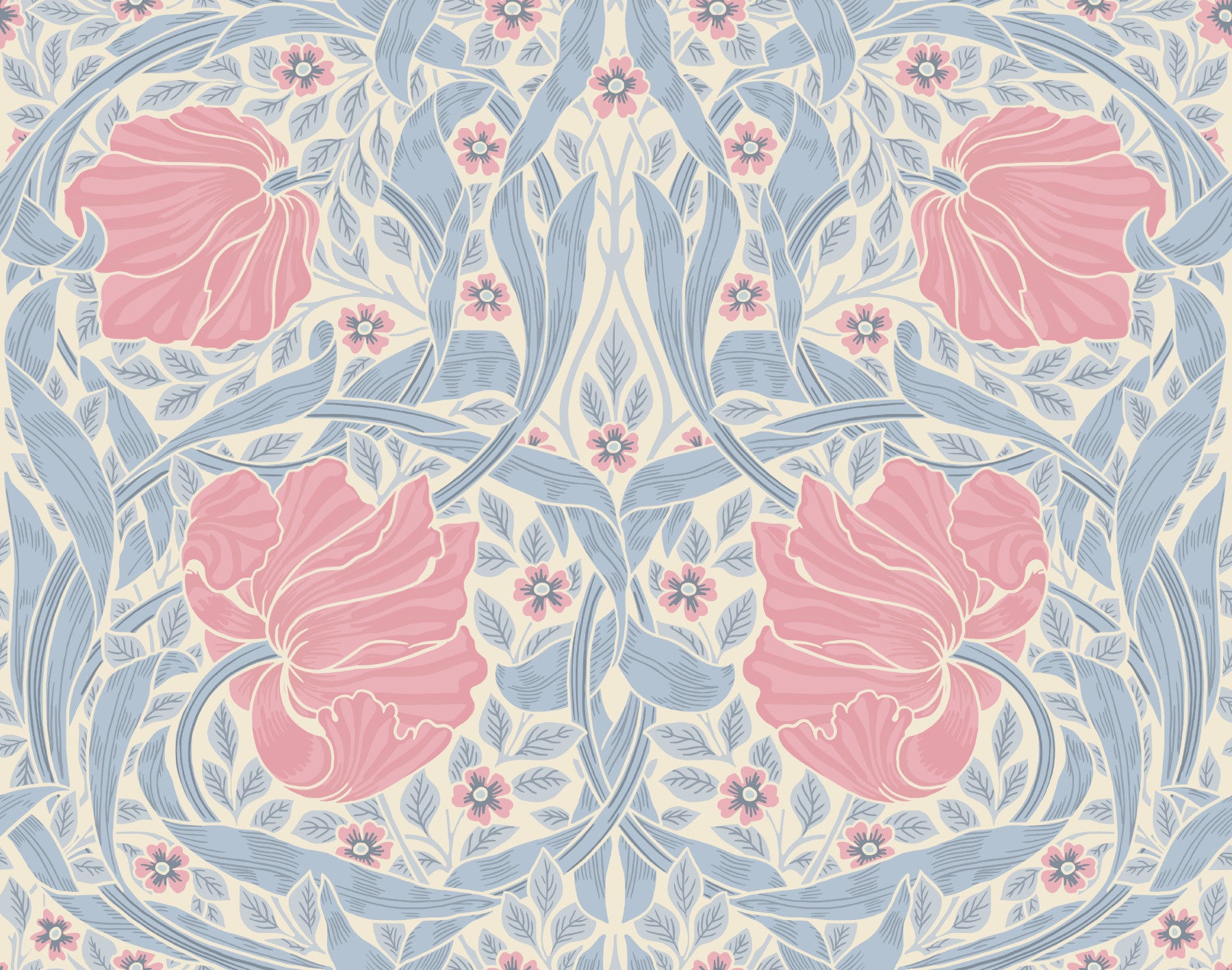 Forkæl dig med den fredfyldte skønhed af "Pimpernel af William Morris 15." Dette tapet viser et fængslende Art Nouveau-design med delikat rødme lyserød pimpernelblomster sammenflettet med flydende, sølvfarvede blade. Den komplicerede detaljerede og elegante symmetri skaber en beroligende, romantisk atmosfære. Subtile, strukturerede linjer og en blød, cremet baggrund forbedrer den overordnede følelse af raffinement og tidløs stil. Perfekt til at tilføje et strejf af klassisk elegance og fredelig ro til ethvert rum.