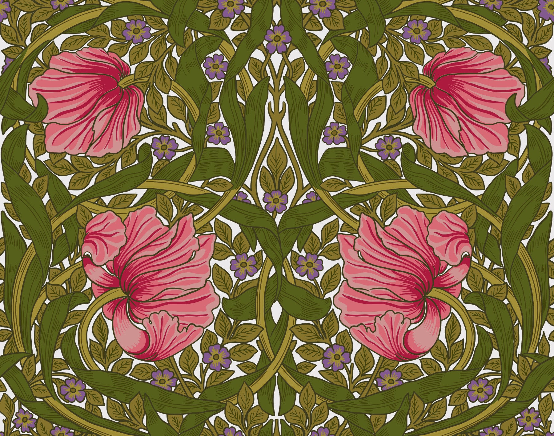 Omfavn Arts & Crafts-bevægelsens elegance med "Pimpernel by William Morris 18". Dette tapet fremviser et fængslende design med farvestrålende lyserøde pimpernelblomster, der er indviklet sammenflettet med frodige grønne blade og sarte lilla accenter. Den detaljerede, næsten træsnitlignende stil er karakteristisk for Morris' arbejde og skaber en tidløs og sofistikeret æstetik. Det gentagne mønster giver en følelse af rytme og balance, perfekt til at tilføje et strejf af klassisk skønhed til ethvert rum. Dette tapet fremkalder en følelse af ro og naturlig charme og bringer et stykke historie og kunstnerisk mesterskab ind i dit moderne rum.