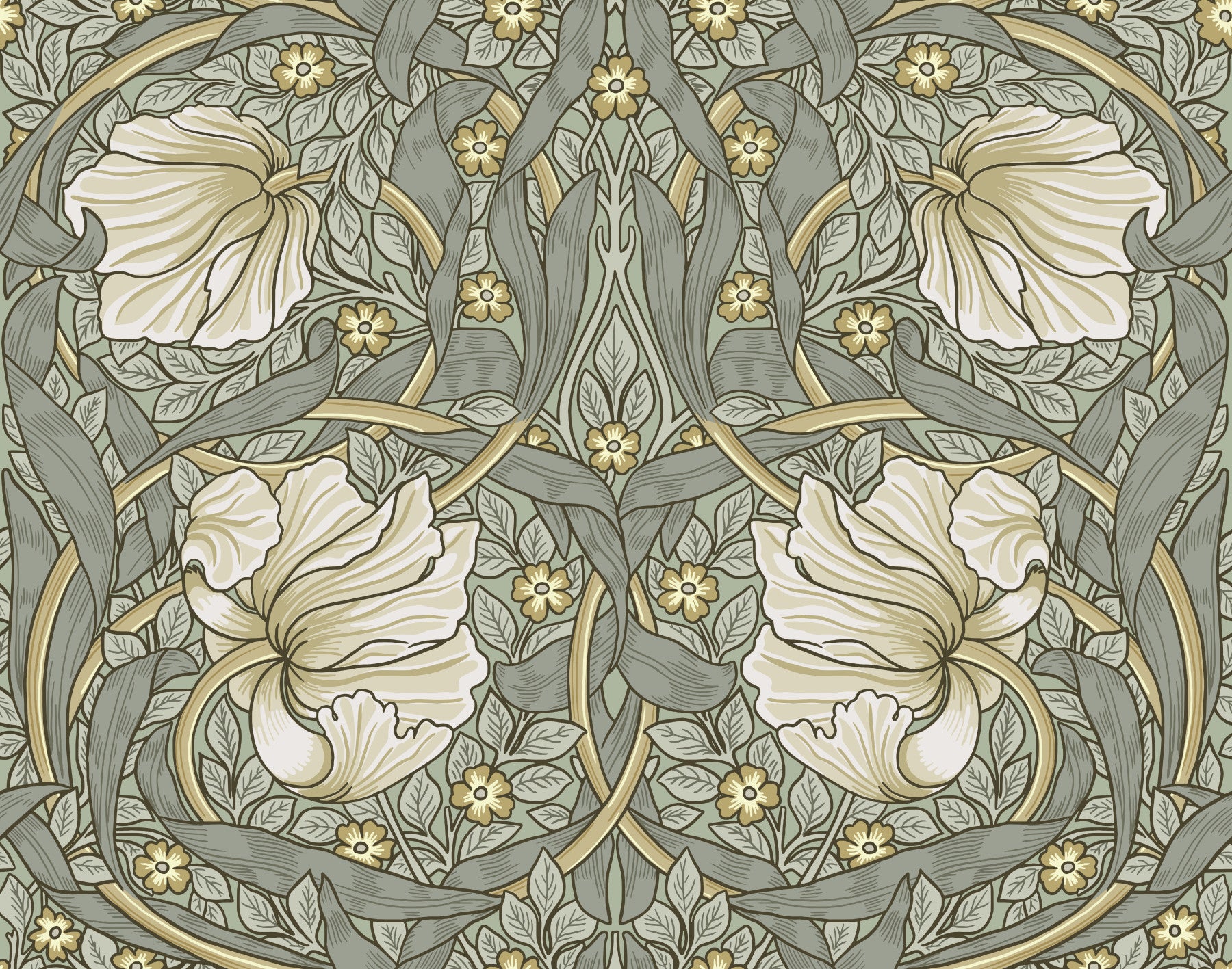 Forkæl dig med den raffinerede elegance af 'Pimpernel af William Morris 2', et digitalt tapet, der gentager mesterens kunst. Dette design viser et fængslende samspil af stiliserede cremefarvede pimpernelblomster, omhyggeligt gengivet med detaljerede kronblade og delikate årer. Disse blomsterskønheder er yndefuldt sammenflettet inden for et frodigt tapestry af krumme blade og mindre blomster i dæmpede greener og guld. Det komplicerede, næsten arkitektoniske, arrangement af de botaniske motiver skaber en følelse af rytmisk symmetri og tidløs sofistikering, perfekt til at tilføje et strejf af Art Nouveau -charme til dit digitale rum. Den subtile farvepalet og den rige detalje skaber en rolig og sofistikeret atmosfære.