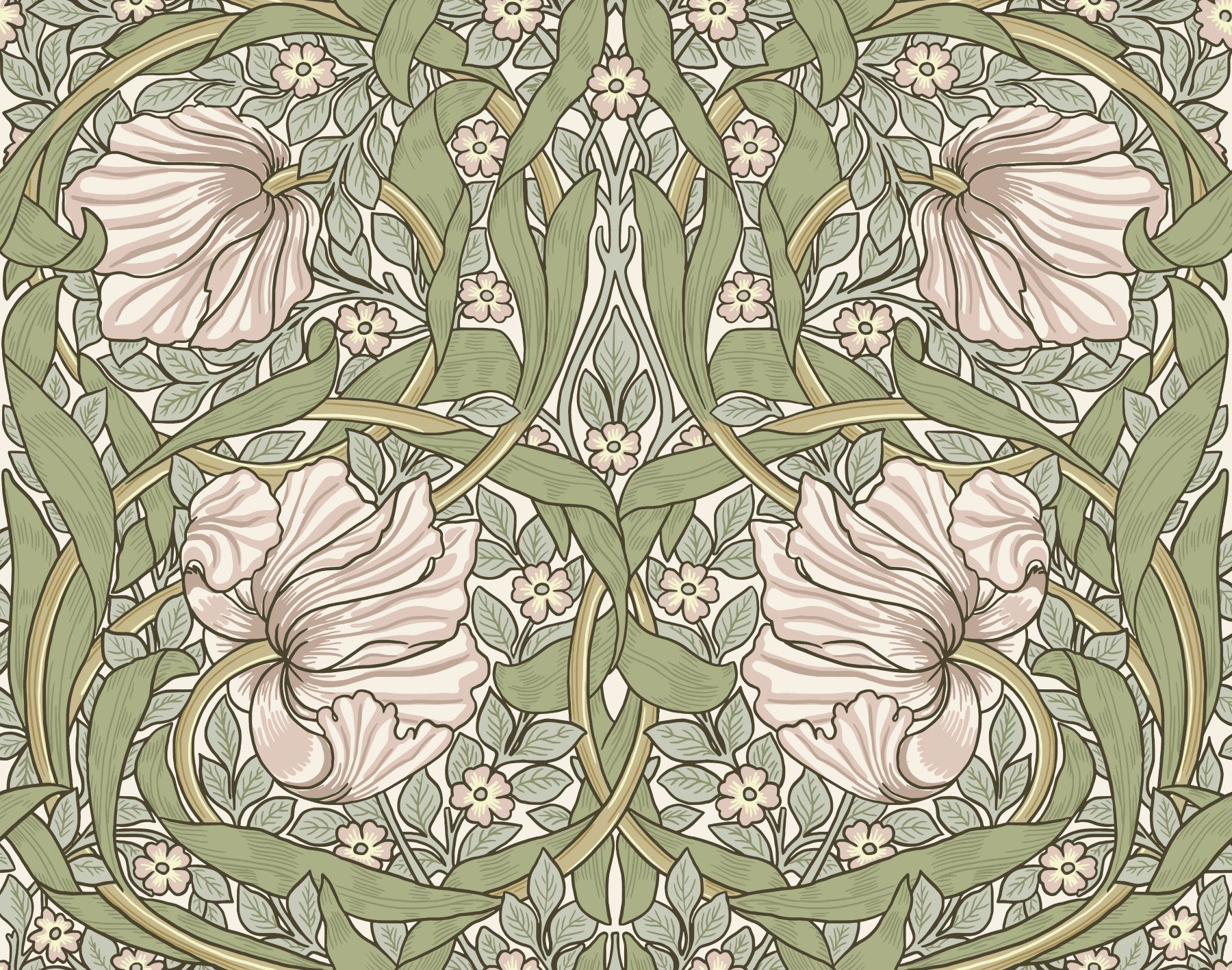 Forkæl dig med den tidløse elegance af "Pimpernel af William Morris 4." Dette tapetdesign viser et fængslende samspil af delikate pimpernelblomster og frodige løv, der er gengivet i en beroligende palet af dæmpede greener og rødme pink. De komplicerede, flydende linjer og symmetriske sammensætning er kendetegnende for kunst- og håndværksbevægelsen, hvilket skaber en sofistikeret og beroligende atmosfære. Intrikat detaljerede blade flettes sammen med stiliserede blomster, hvilket resulterer i et rigt tekstureret og visuelt tiltalende mønster perfekt til at tilføje et strejf af klassisk skønhed til ethvert rum. Oplev den raffinerede charme af William Morris 'visionære kunstnerskab med dette elegante og tidløse tapet.