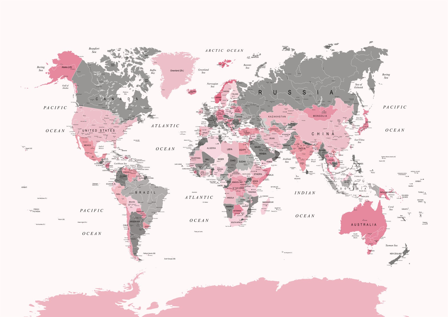Dette verdenskort viser en sofistikeret overtagelse af kartografi. Pink og grå nuancer definerer lande, der er sat på en blød baggrund. Dette design gør fantastisk tapet til vægge. Perfekt til et kontor, en teen soveværelse eller stue, dette kort stimulerer nysgerrighed og bringer en verdslig æstetik til dit rum. Dens dæmpede palet sikrer, at den supplerer en række indvendige stilarter, hvilket gør dine vægge både informative og moderigtige.