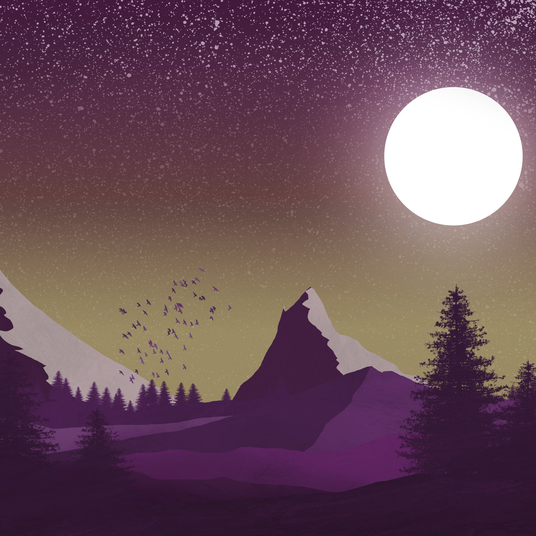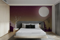 Dette tapet, med titlen 'Purple Peaks Under the Moon', fanger en fantastisk enkel, men alligevel stemningsfuld scene. De dybe lilla bjerge er silhuetteret mod en struktureret, stjernetøvet himmel, med en stor, lys måne, der belyser landskabet. Inkluderingen af ​​en flok fugle tilføjer en følelse af bevægelse og liv til den ellers rolige scene. Farvepaletten er sofistikeret og beroligende, ideel til at skabe en fredelig og reflekterende atmosfære på dine digitale enheder. Billedet er perfekt afbalanceret og tilbyder en sofistikeret, men alligevel let fordøjelig æstetik.