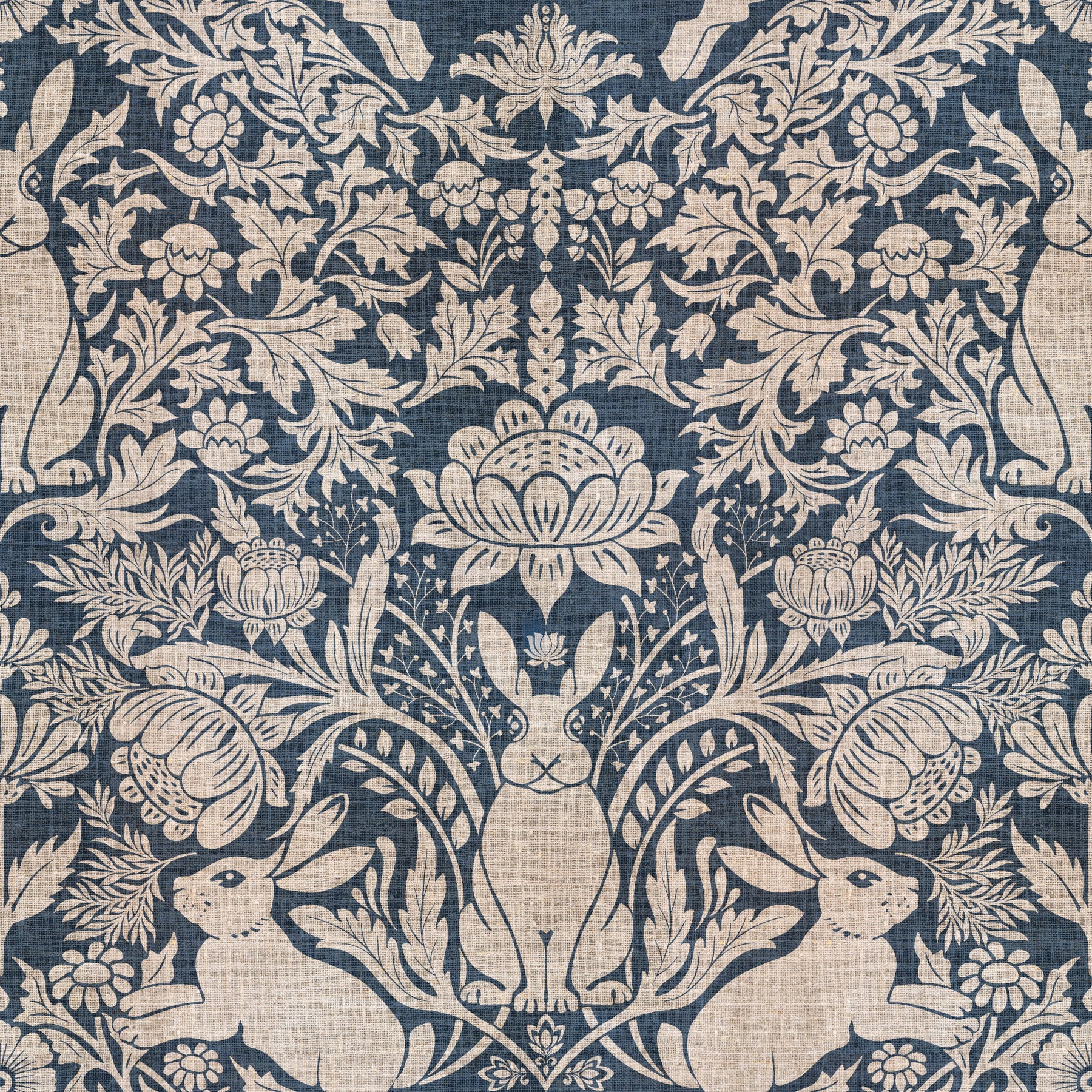 Invite nature indoors with this captivating wallpaper for walls! The intricate design features stylized rabbits amid blooming florals and foliage, creating a classic and peaceful atmosphere. Soft beige patterns on a deep blue background offer a unique contrast, making it perfect for bedrooms, living rooms, or dining areas. It adds a touch of country charm, blending effortlessly with traditional or modern interiors. Experience the timeless appeal of this refined print.