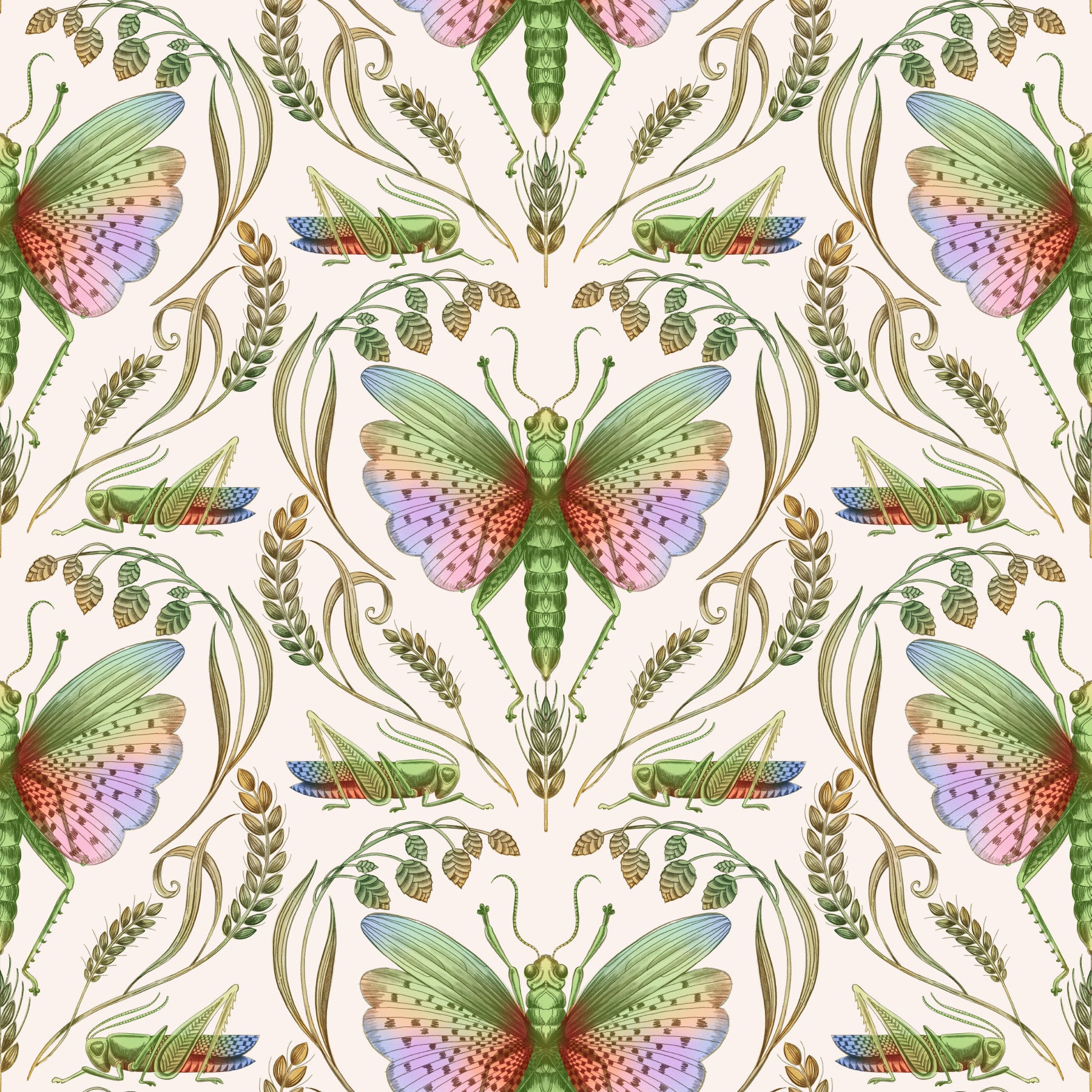 Et fængslende tapet med et delikat damaskmønster sammenvævet med livlige, regnbue-farvede græshoppere. Intrikate botaniske elementer, inklusive hvedestængler og delikate blomsterkviste, skaber en let og luftig fornemmelse. De iriserende vinger i den centrale græshopper befaler opmærksomheden, der kontrasterer smukt mod de dæmpede greener og brune i baggrunden. Dette elegante design blander Naturens kunstnerskab med et sofistikeret Damask -motiv, perfekt til at tilføje et strejf af finurlig sofistikering til enhver digital enhed.
