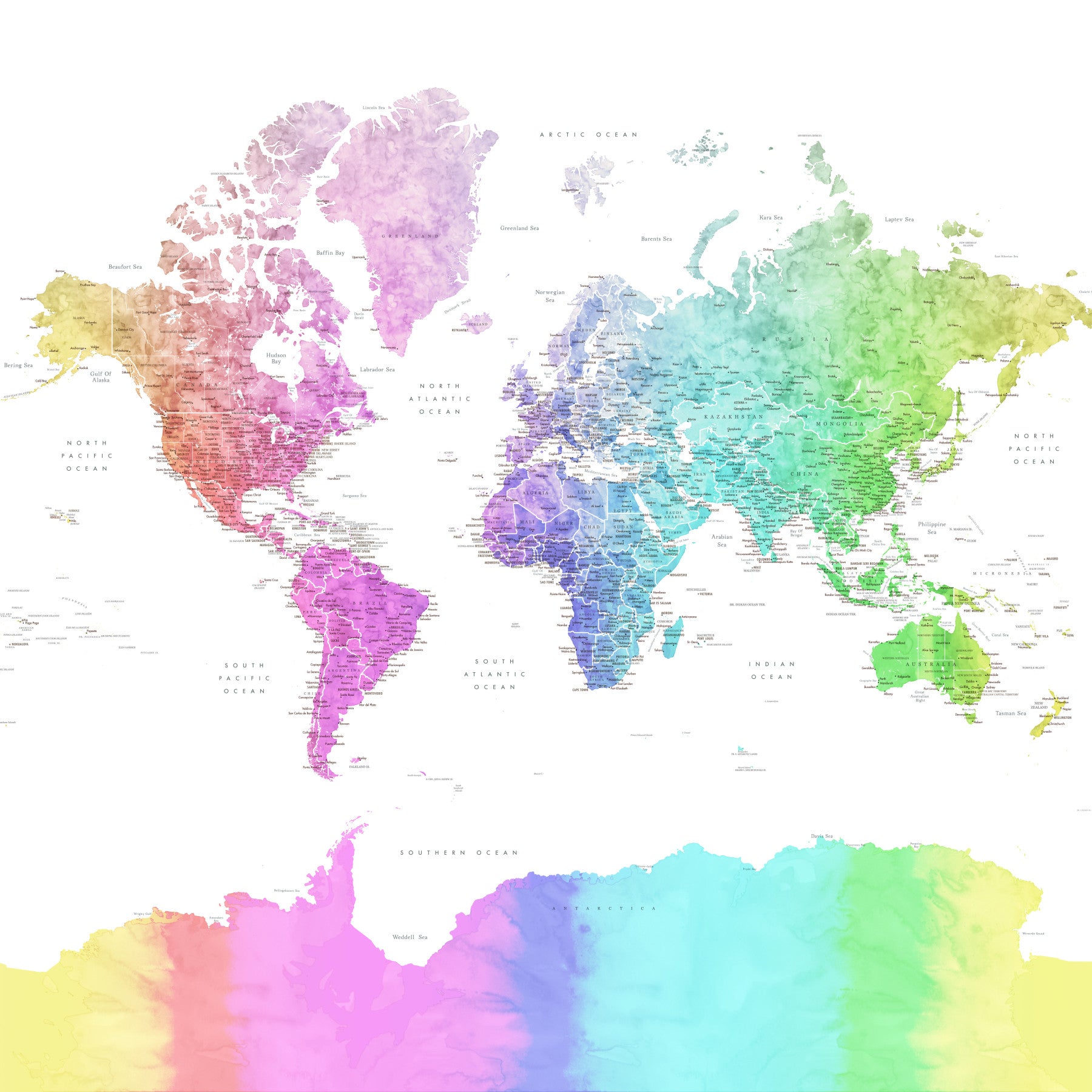 Watercolor-style world map in rainbow tones for walls