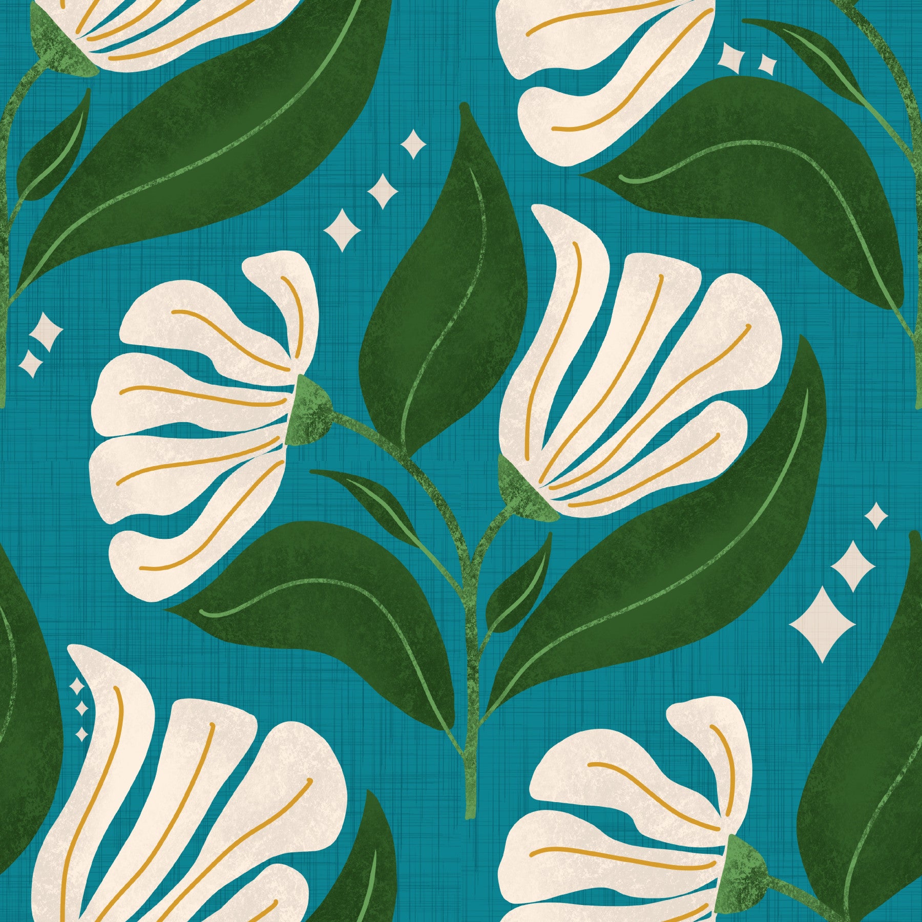 Features large, stylized flowers in cream color.