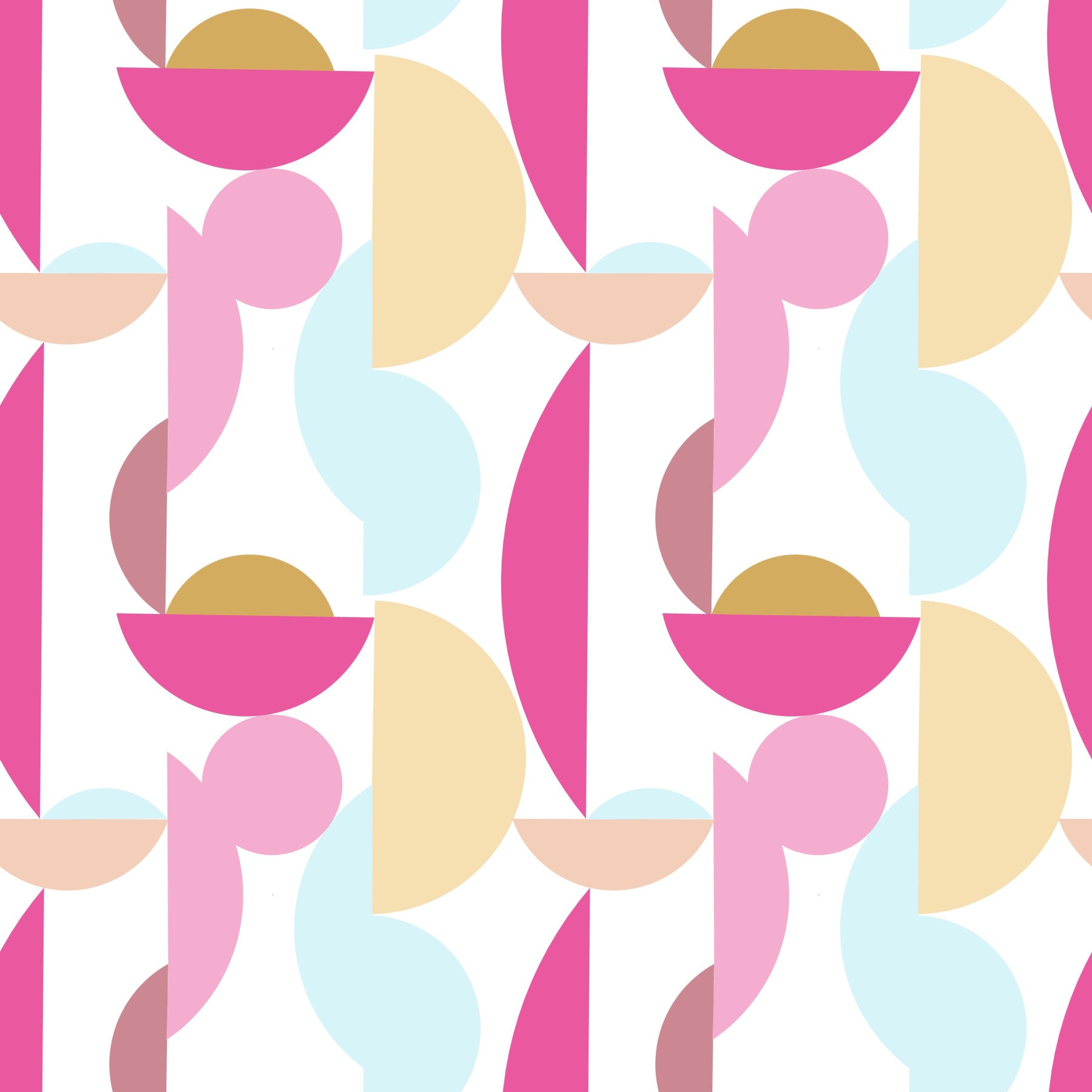 Unique Retro Geo Blush wall covering artistic repeating shapes soft bright colours.