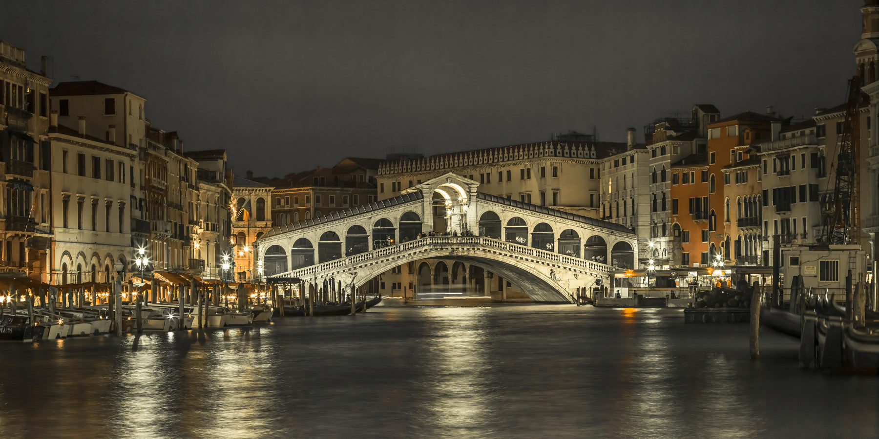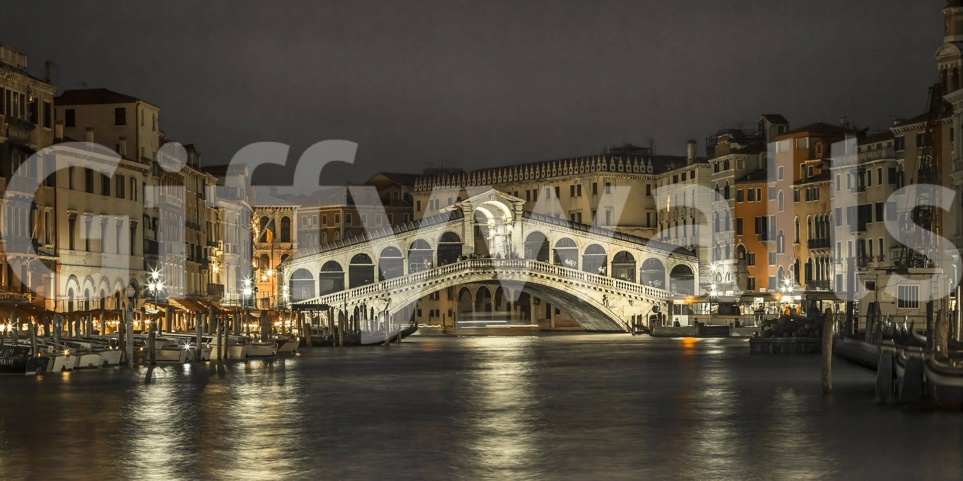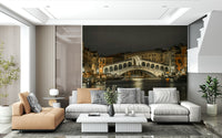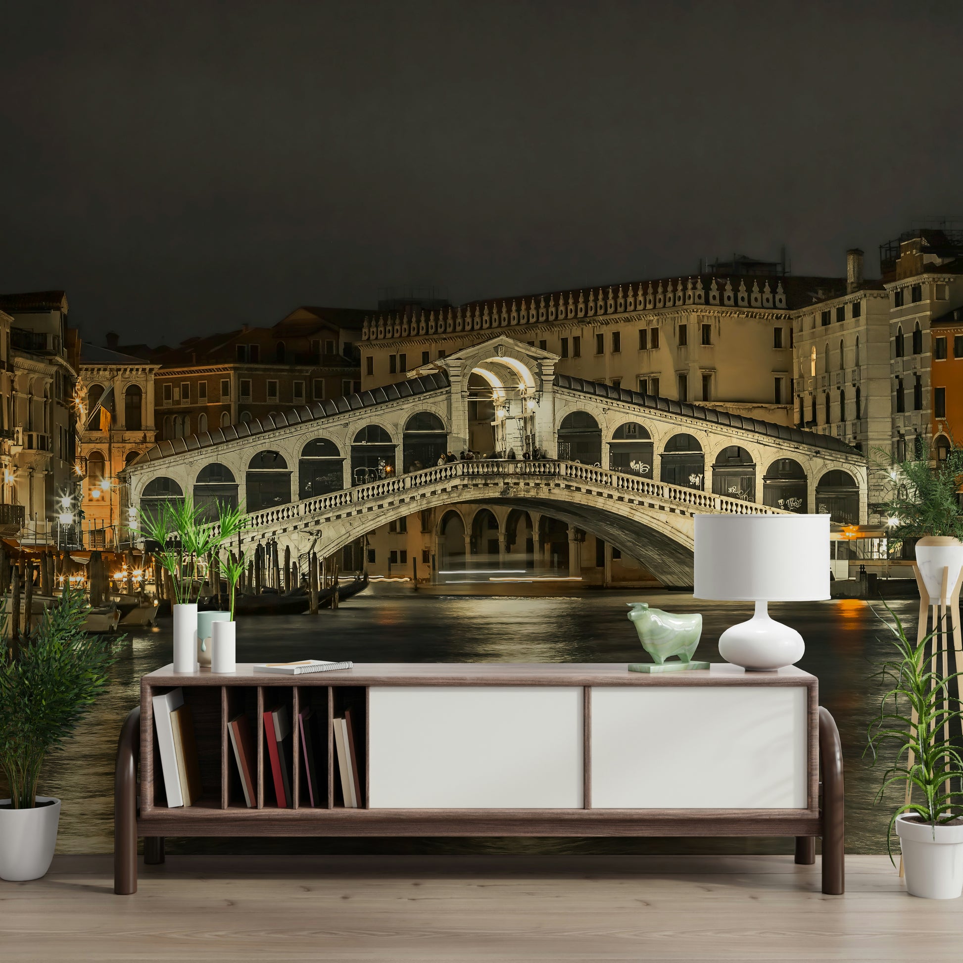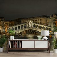 The grand canal and the Rialto bridge at night, Venice, Italy. This breathtaking wallpaper for walls captures Venice's iconic Rialto Bridge at night. The illuminated landmark reflects beautifully on the Grand Canal. Buildings on either side glow with warm light, creating a captivating scene. The design introduces a touch of Italian romance to bedrooms, living rooms, or dining areas. The detailed architecture and serene atmosphere enrich interiors with a sense of history and elegance. Suitable for creating a sophisticated feature wall.