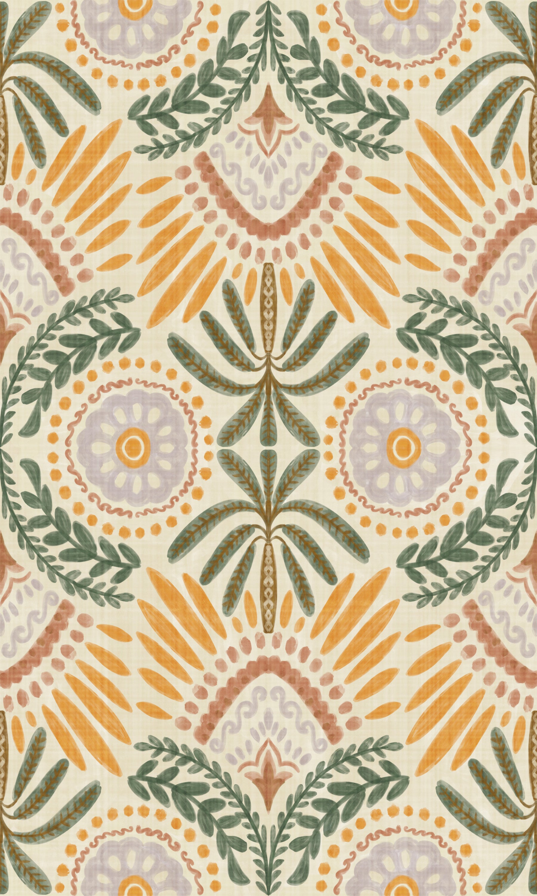 Dette tapetdesign fremkalder en følelse af ro med sin bløde, dæmpede farvepalet og indviklede botaniske mønstre. Den håndmalte stil tilføjer et strejf af kunstnerskab, mens det gentagne design skaber en problemfri og beroligende effekt. Varme jordagtige toner af beige, orange og støvede rose suppleres med kølige greener, hvilket skaber en afbalanceret og sofistikeret æstetik. Ideel til soveværelser, stuer eller ethvert rum, hvor en fredelig atmosfære ønskes. Den subtile struktur af designet tilføjer dybde og visuel interesse, hvilket gør det til et alsidigt valg til forskellige designstilarter.