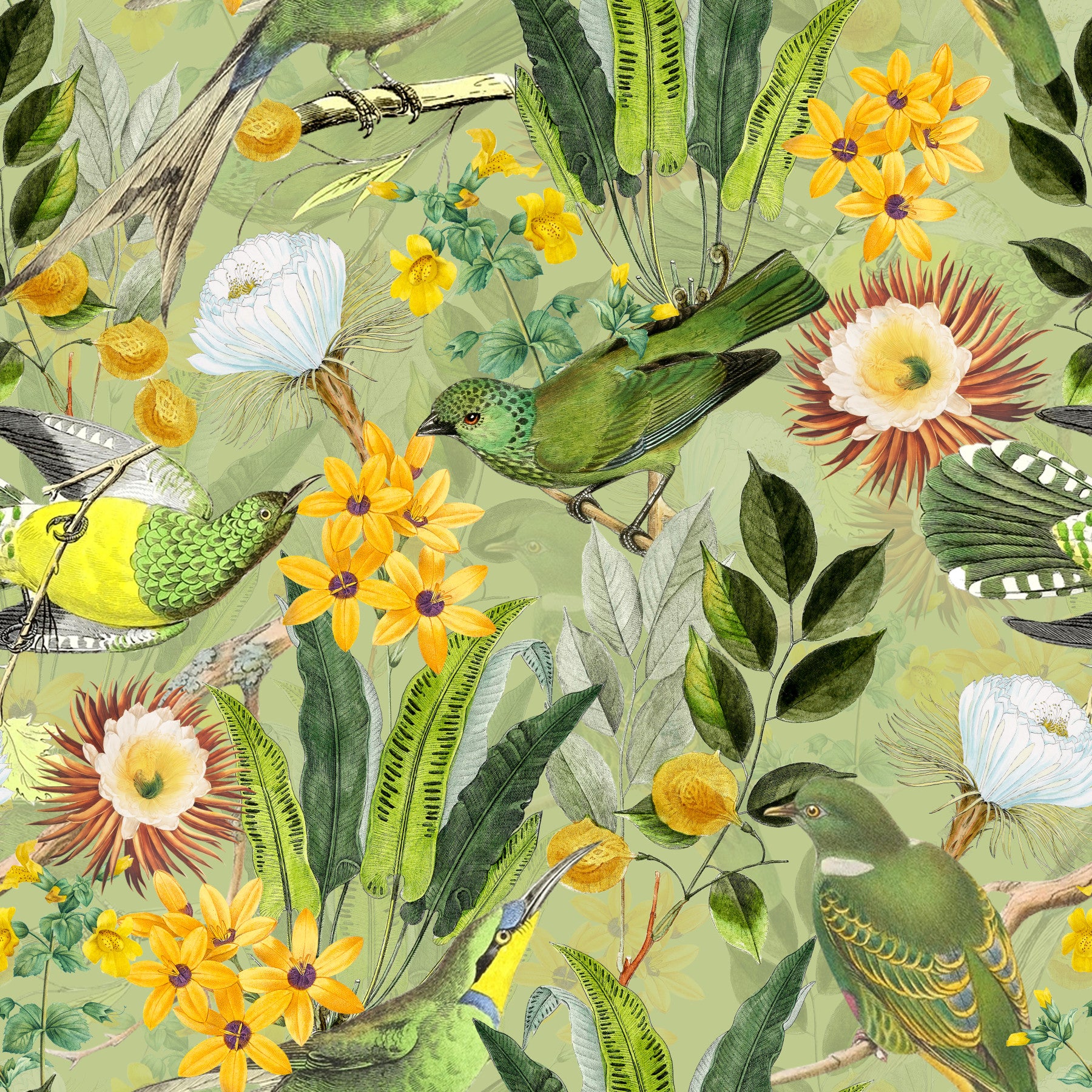 Dyber dig selv i roen i et frodigt tropisk paradis med dette udsøgte tapet. Detaljerede botaniske illustrationer af livlige gule blomster, frodigt løv og intrikat gengivne fugle skaber en følelse af rolig og sindsro. Den bløde salvie grønne baggrund forbedrer de livlige farver på floraen og faunaen og fremkalder en følelse af flugt til et skjult, fredeligt tilflugtssted. Perfekt til at tilføje et strejf af eksotisk elegance til ethvert rum, dette tapet er et vidnesbyrd om naturens skønhed, der fanger de delikate detaljer i den naturlige verden med kunst og præcision.