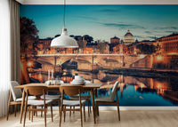 Capture the enchanting allure of Rome at twilight with this wallpaper for walls. The image features the Tiber River reflecting the iconic St. Peter's Basilica and a historic bridge. Warm orange lights contrast against a cool blue sky, creating a dramatic yet serene atmosphere. Consider this for your living room or hallway to bring a touch of European elegance and historical depth to your decor. The design complements interiors with classic or modern design, turning any room into a visual journey.