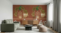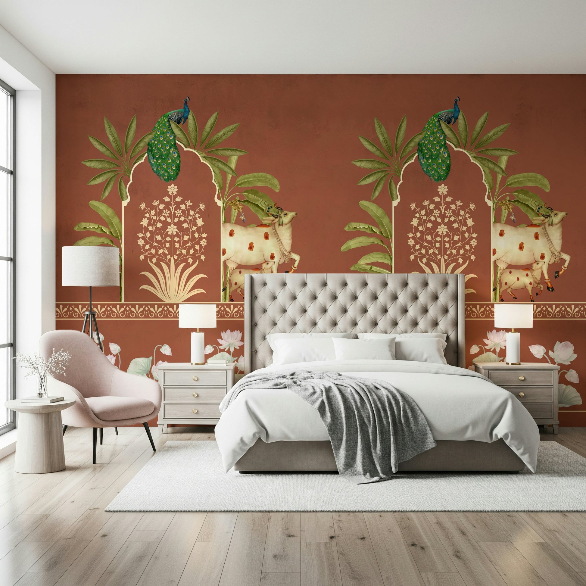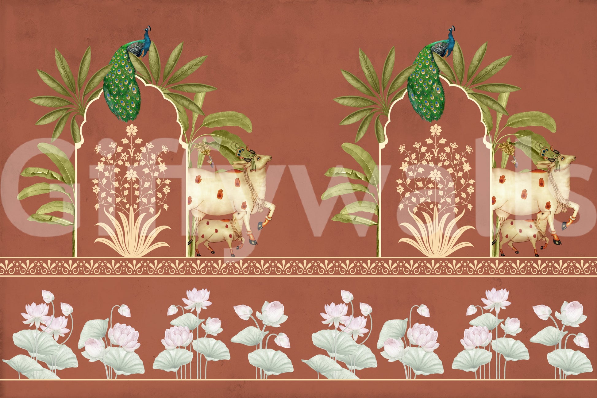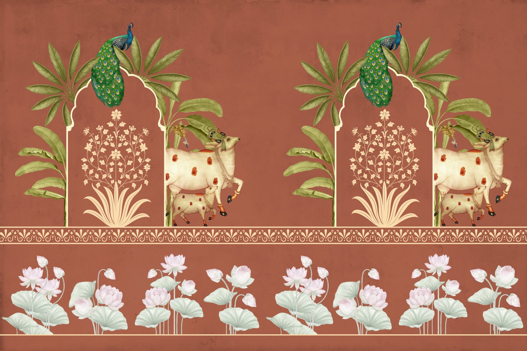 Transform your space with 'Royal Pichwai Heritage,' a wallcovering that encapsulates the opulence and artistry of traditional Indian Pichwai paintings. Set against a warm terracotta backdrop, this design features majestic peacocks perched amidst lush foliage, reminiscent of ancient palace gardens. Sacred cows, adorned with intricate detailing, gracefully parade through archways, symbolizing prosperity and abundance. Delicate lotus blossoms cascade along the base, adding a touch of serene beauty and purity. This artful composition breathes life into any room, infusing it with a sense of timeless elegance and cultural richness. Embrace the regal charm and spiritual significance of 'Royal Pichwai Heritage' to create an atmosphere of sophisticated grace and tranquil harmony within your home.