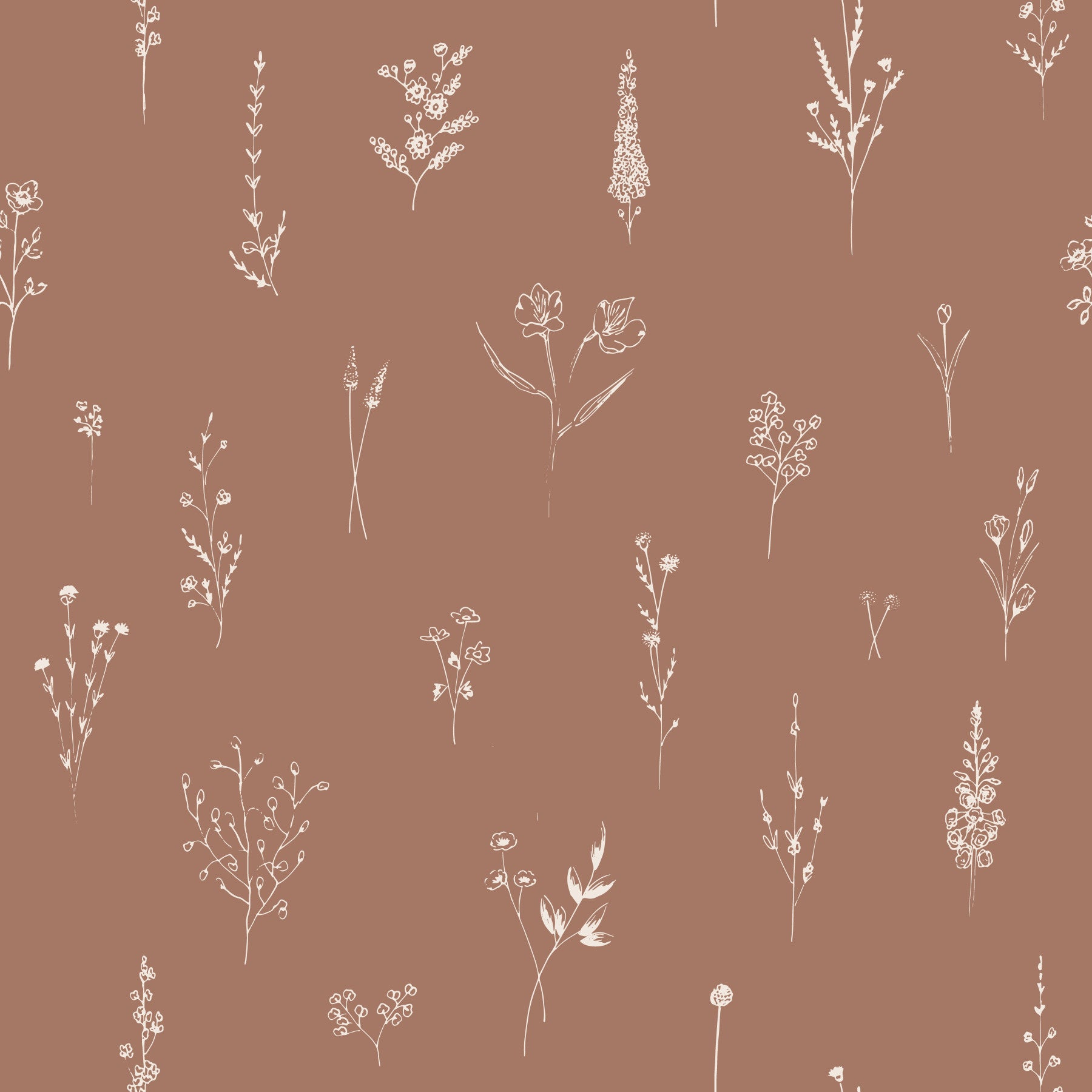 Warm earthy wallpaper showcasing dainty sketched flowers arranged in a loose, airy layout