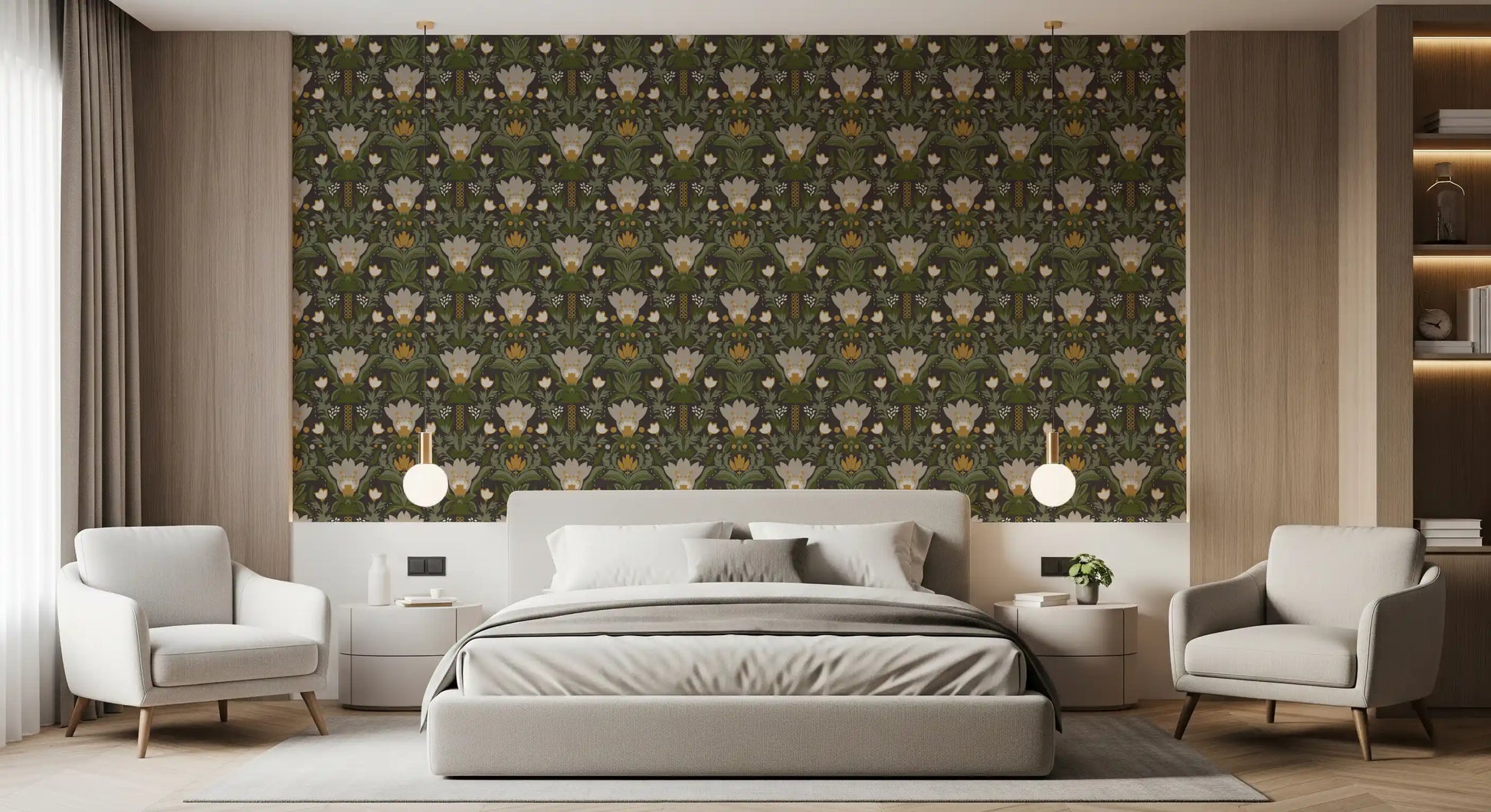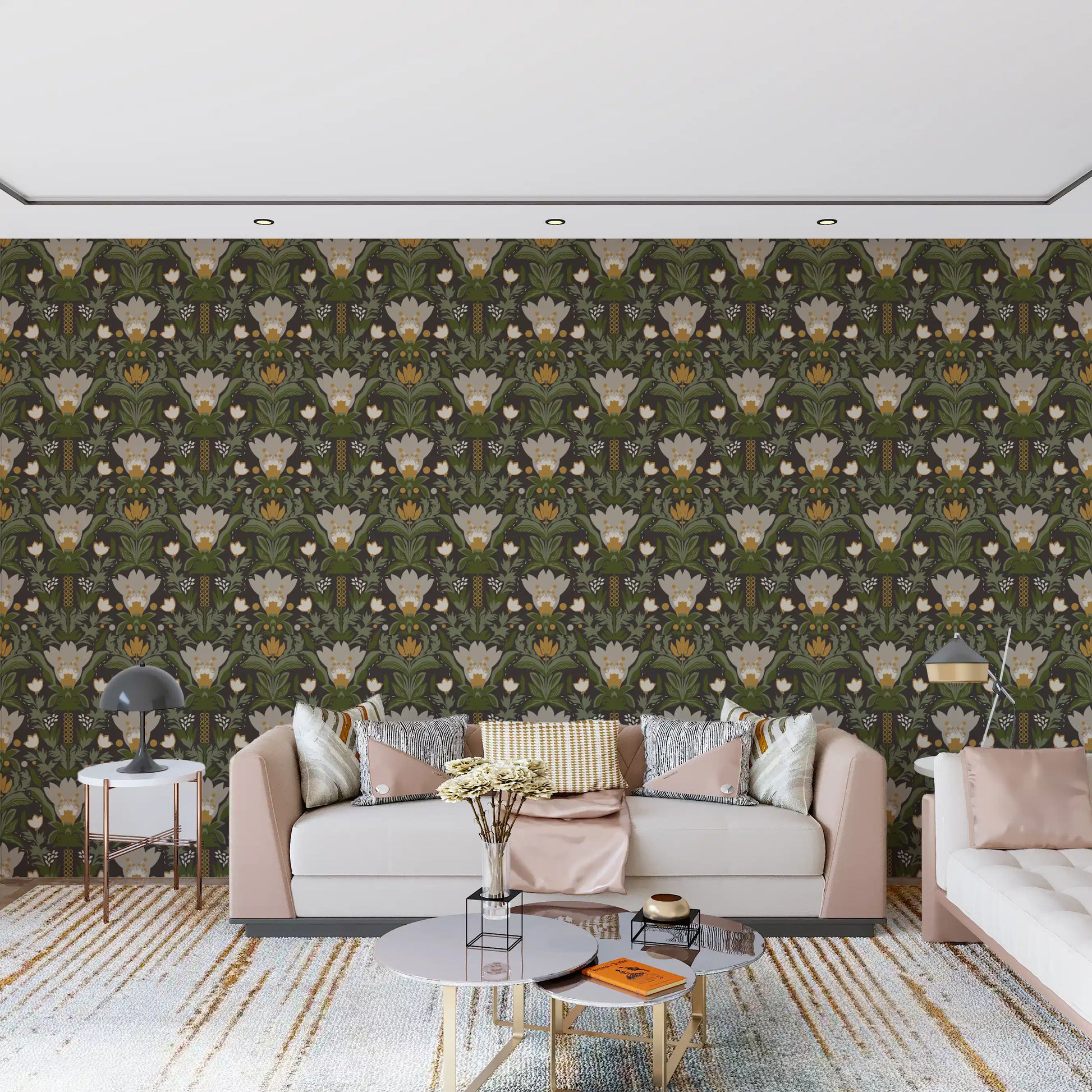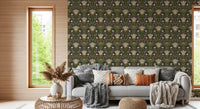 Skandinavisk folkekunst blomsterhave – Jordnært botanisk mønster med salviegrønne blade, cremefarvede blomster og sennepsguld accenter på mørkebrunt tapet