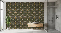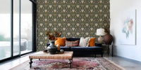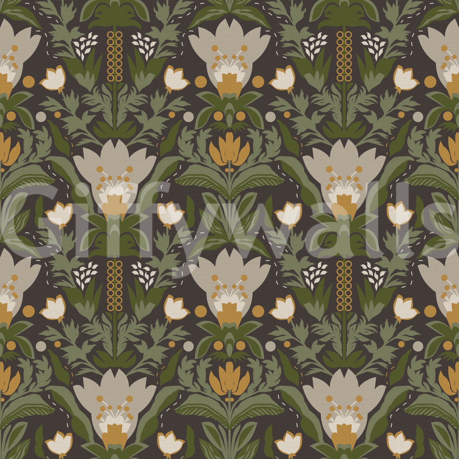 Skandinavisk folkekunst, nordisk blomstermønster, botanisk mønster, symmetrisk blomstermønster, folkehave, vintage botanisk, jordnær farvepalet, salviegrønne blade, sennepsgule blomster, cremefarvede blomster, mørkebrun baggrund, cottagecore-blomstermønster, folkekunstmønster, skovbotanisk, retro naturtryk, traditionelt folkemotiv, dekorativ botanisk, stiliserede blomster, skandinavisk cottagestil, naturligt havemønster, organisk blomsterdesign, arv af folkemønster, naturinspireret tekstil, finurlig botanisk, gentagende blomstermønster, håndtegnet blomsterstil, folkebotanisk tapet, rustik blomstergentagelse