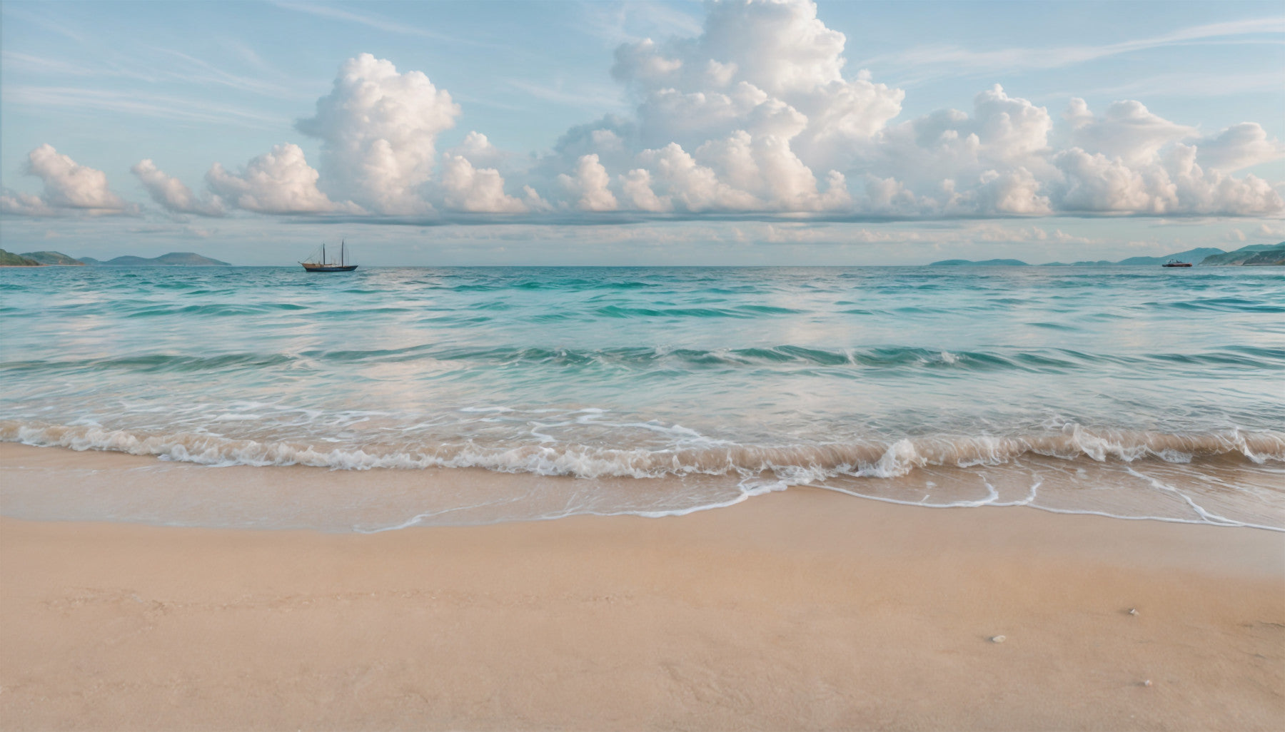 Embrace the tranquility with this beautiful beach scene. It features gentle waves meeting a serene sandy beach under a peaceful sky with fluffy clouds. The soft palette, including shades of blue and beige, creates a relaxing vibe. This stunning wallpaper for walls works well in bedrooms, bathrooms, or even a home office. The scene adds a calming element to interiors, creating a serene getaway at home.
