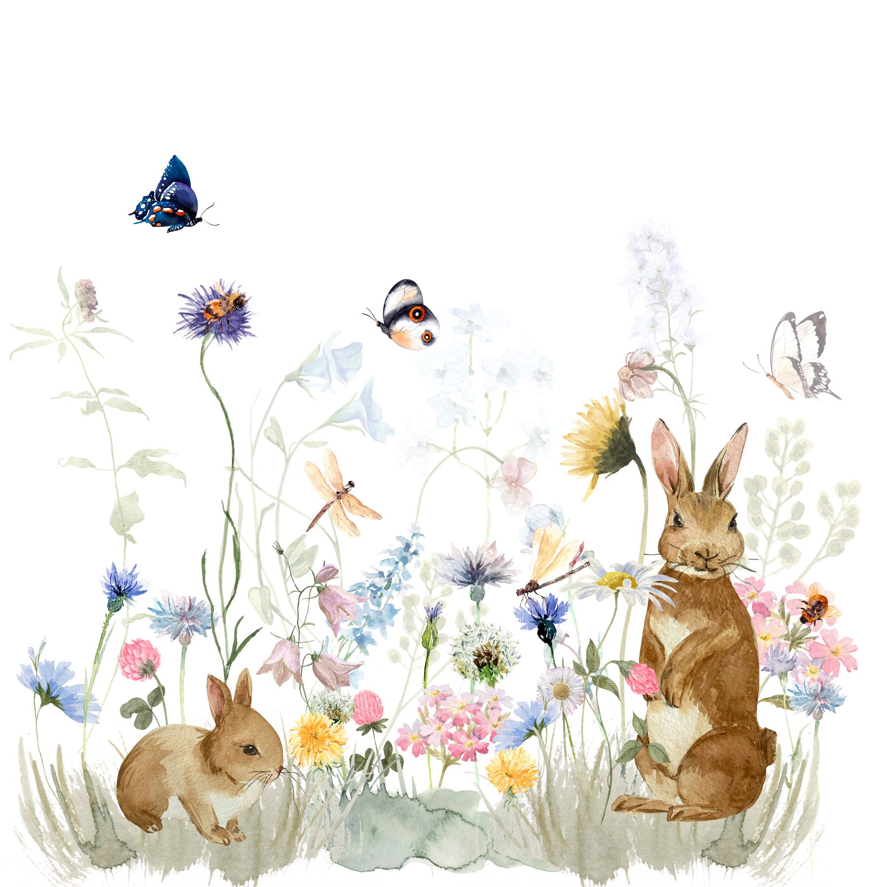 Undslippe til en hemmelig have med dette fængslende akvarel tapet. To søde kaniner deler midterste scene midt i en overflod af delikate vilde blomster, som yndefuldt interagerer med sommerfugle og Dragonflies. Den bløde, dæmpede farvepalet af pink, blues og gule skaber en rolig og indbydende atmosfære, perfekt til at tilføje et strejf af blid finurlig til en børnehave, soveværelse eller boligareal. De detaljerede blomsterelementer og charmerende kaniner inviterer til en følelse af fred og sindsro.