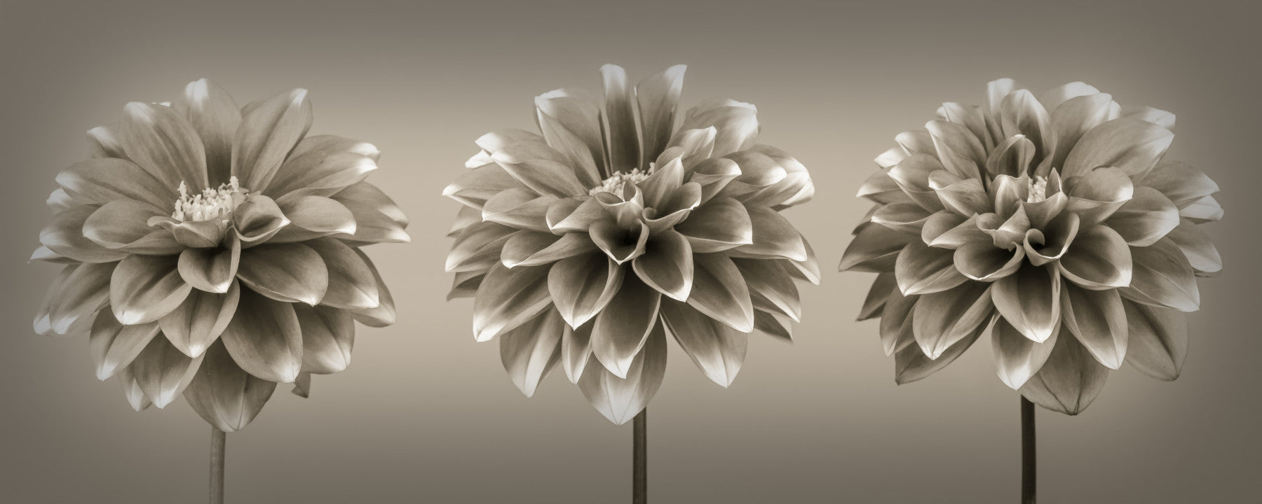 Grayscale dahlia blossoms, large Sepia Dahlia Trio artistic print wallpaper.