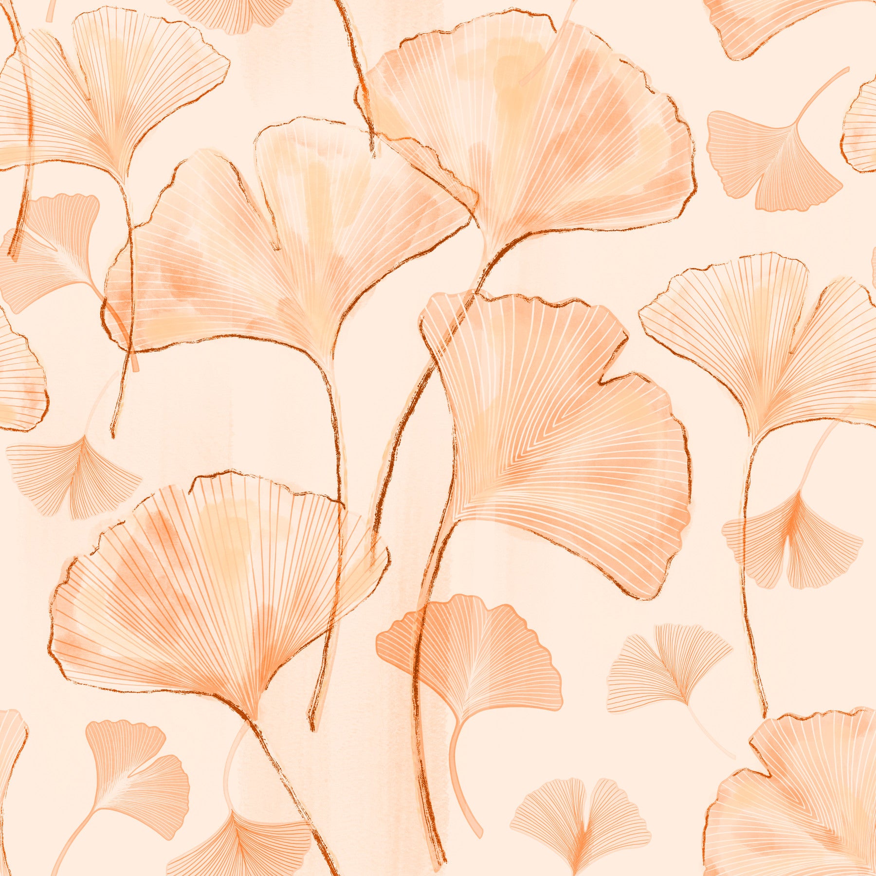 Immerse yourself in the tranquil beauty of Serene Ginkgo in Peach Hues a wallpaper that evokes a sense of peace and understated elegance. This captivating design features gracefully stylized ginkgo leaves, rendered in a soft palette of peach and cream. The delicate lines and gentle shading create a soothing visual rhythm, transforming any space into a haven of tranquility. Each leaf is meticulously detailed, capturing the unique fan-like shape and intricate venation of the ginkgo, a symbol of resilience and longevity. The subtle variations in color and texture add depth and visual interest, while the overall composition exudes a calming and harmonious vibe. Perfect for creating a serene atmosphere in bedrooms, living areas, or offices, this wallpaper is a timeless choice for those seeking to infuse their surroundings with natural beauty and a touch of sophisticated charm.