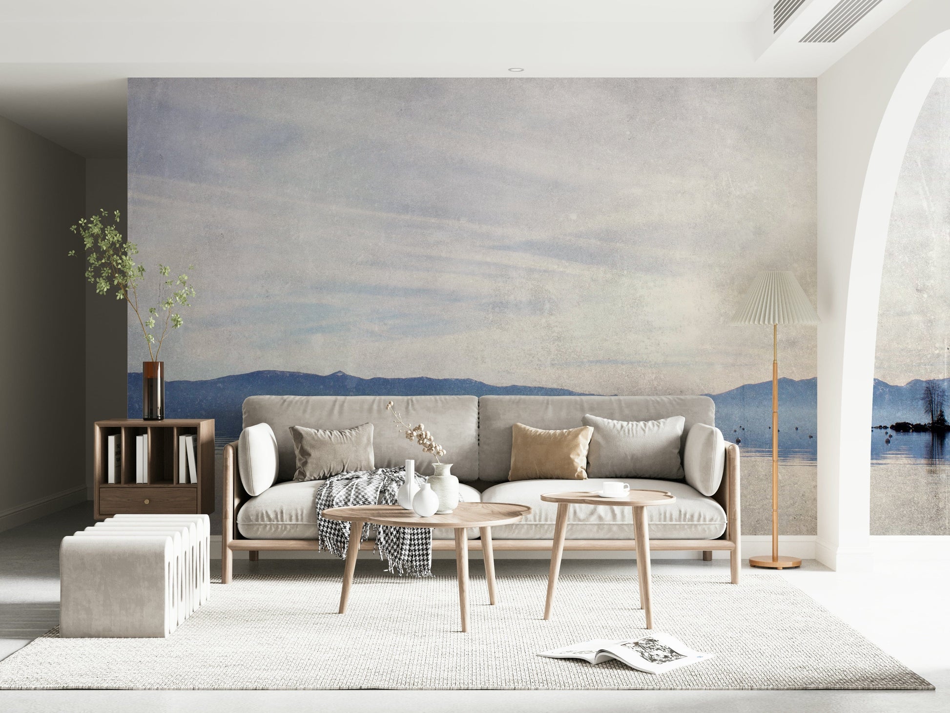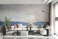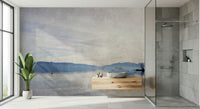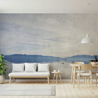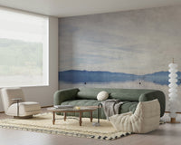 Evoke calmness with this serene lake scene. Gentle colors meet distant mountains, creating an ideal backdrop for peaceful reflection. The design uses a soft, slightly textured effect. It introduces tranquility to your home. Use this wallpaper for walls to establish a relaxing atmosphere in bedrooms, living rooms, or even home offices. The pale blues and grays complement interiors. The design adds a touch of nature and understated elegance to your space.
