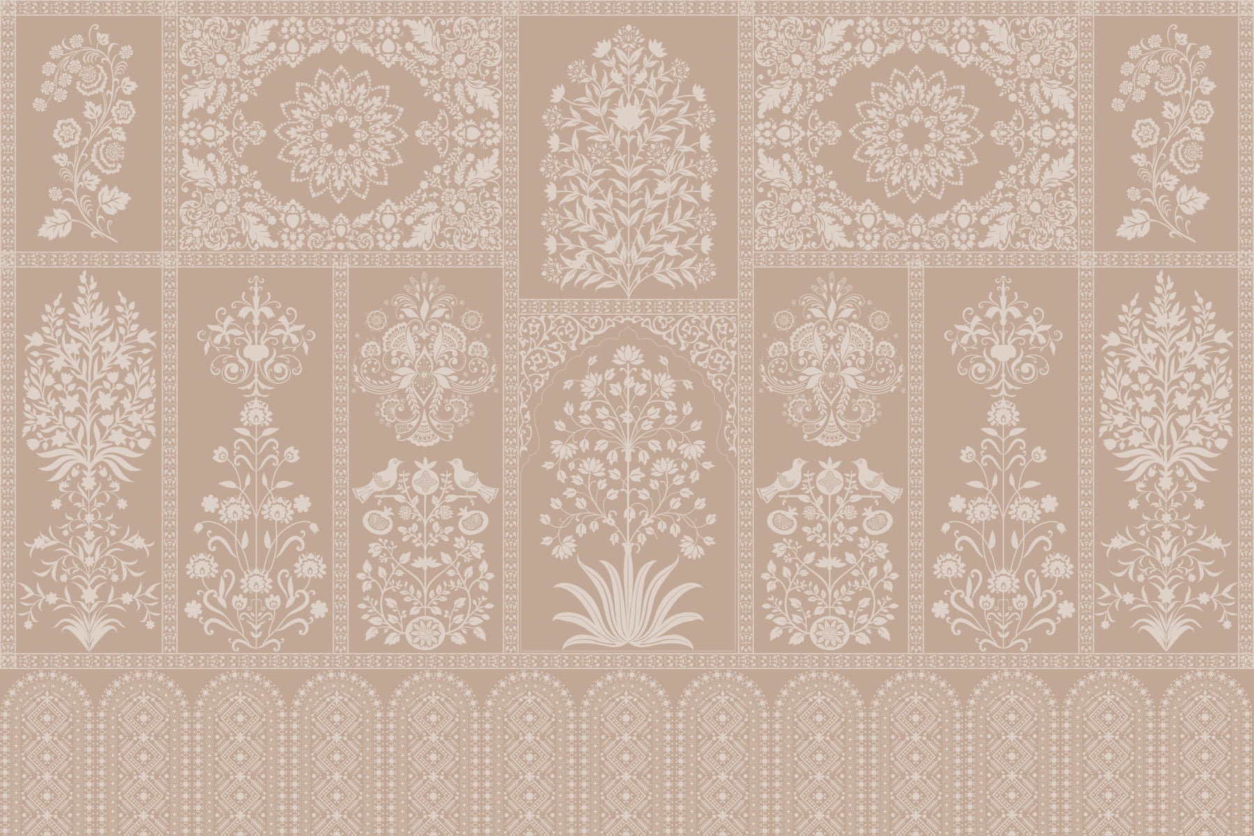 Immerse yourself in the intricate artistry of 'Shilpkaar', a wallpaper design that celebrates the meticulous craft of traditional Indian art. This elegant pattern features delicate floral motifs and geometric details, all rendered in a sophisticated, monochromatic palette. The design evokes a sense of timelessness and refined beauty, reminiscent of handcrafted textiles and Mughal-era architecture. Delicate flowers, stylized trees, and stylized birds are organized into framed section. 'Shilpkaar' is more than just a wallpaper; it's a tribute to the artisans who have dedicated their lives to creating stunning works of art. Transform your space into a sanctuary of peace and beauty with this exceptional design, perfect for adding a touch of understated luxury to any room. Let the artistry of 'Shilpkaar' elevate your surroundings with its quiet elegance and timeless appeal.