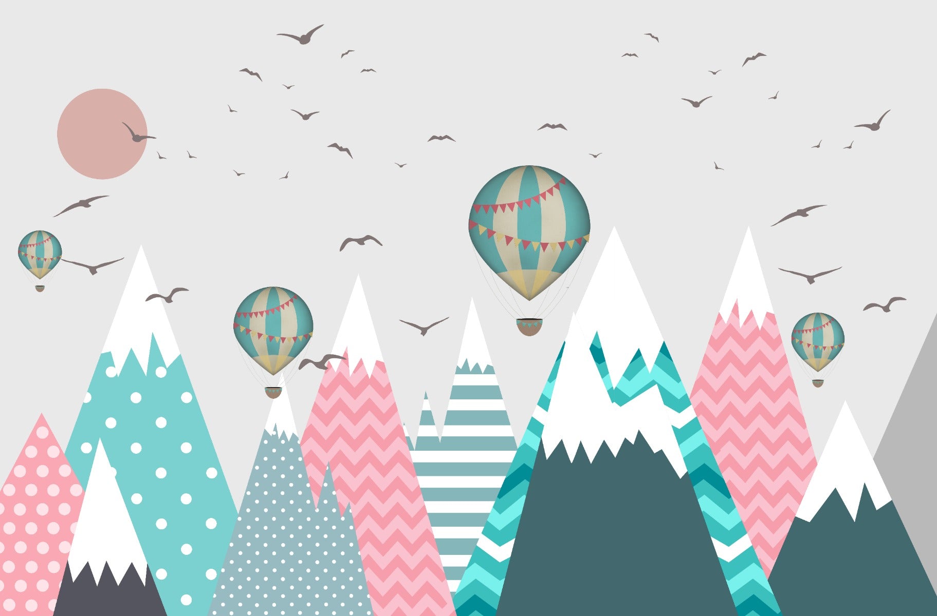 Snowy Mountain Wallpaper Mural with Hot Air Balloons