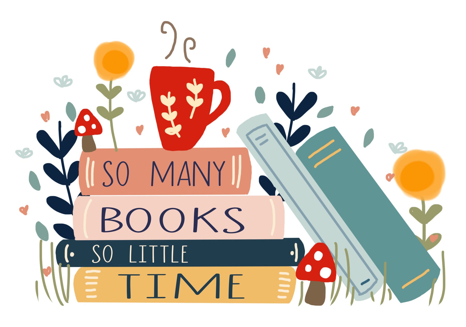 Et charmerende og finurligt tapet med en stak bøger beliggende blandt legende blomsterelementer og finurlige svampe. Et varmt rødt krus dampende te sidder ovenpå bøgerne og antyder hyggelige læsningssessioner. Bøgerne i sig selv er legende mærket med udtrykket 'så mange bøger så lidt tid', der perfekt indkapsler stemningen for enhver ivrig læser. Den bløde farvepalet og håndtegnet stil skaber en afslappet og indbydende atmosfære, hvilket gør dette til det perfekte tapet til bogelskere, der værdsætter et strejf af finurligt og charme i deres digitale rum. Billedet fremkalder en følelse af tilfredshed og den dejlige kamp for at vælge, hvad man skal læse næste.
