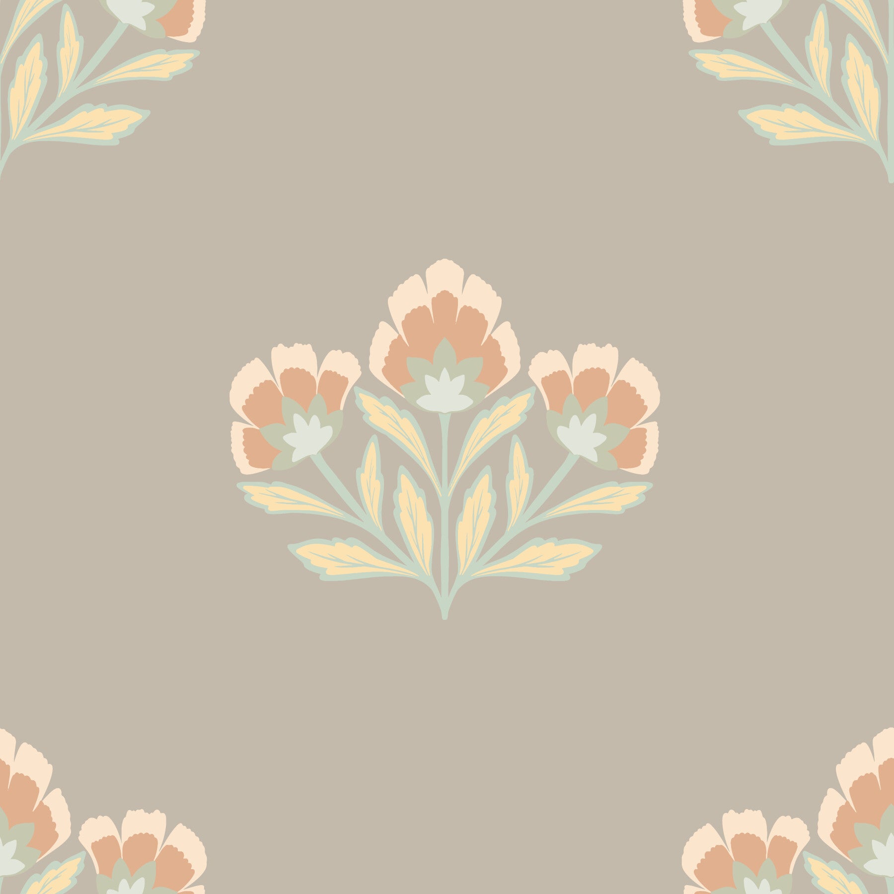 The Serene Flora mural introduces timeless elegance with its beautifully stylized botanical motif. This captivating mural wallpaper showcases delicate flower clusters in soft hues of peach, pale sage, and creamy yellow, set against a chic, dusty taupe background. Inspired by classic global textiles, the repeating pattern offers a feeling of calm symmetry and sophistication. Ideal for creating a serene and cultured atmosphere in bedrooms, dining areas, or studies, this high-quality wall mural works beautifully in both traditional and contemporary settings. Choose this charming wallpaper for walls for an infusion of gentle, artistic grace.