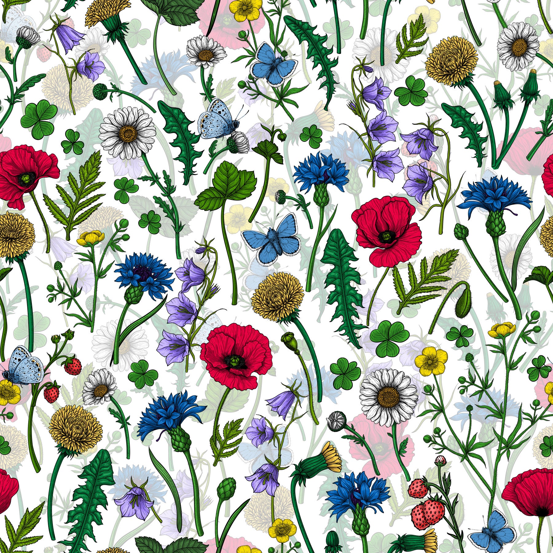 Fresh, floral wallpaper featuring a sunlit summer meadow