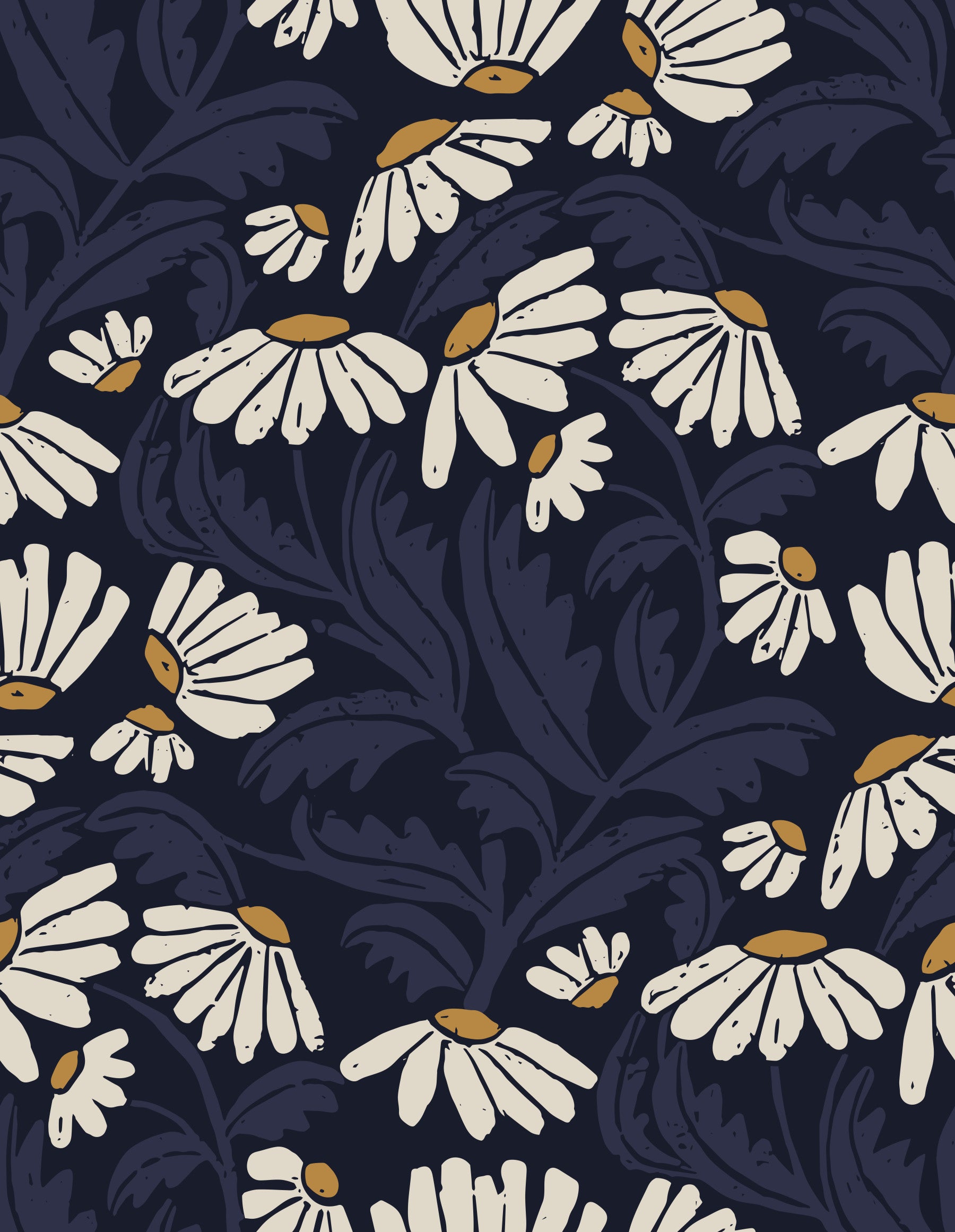 'Starlight Daisies' tilbyder en drømmende flugt med sit fortryllende blomsterdesign. Den dybe marinebaggrund fremkalder en nattehimmel, mens de stiliserede tusindfryd, i blød fløde og varmt guld, ligner stjerner spredt over lærredet. Det let strukturerede udseende af den håndtegnede stil tilføjer visuel rigdom og dybde. Dette tapet bringer en følelse af fred og stille elegance til ethvert rum, perfekt til soveværelser, stuer eller gange. Det gentagne mønster skaber en beroligende visuel rytme, der inviterer afslapning og ro.