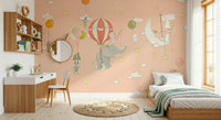 Invite wonder into any room with this charming wallpaper. It pictures an adorable elephant under a hot air balloon, houses floating through the sky, and cute animals sailing on a moon. Soft pastel colors create a peaceful mood. This delightful design is excellent for bedrooms, nurseries, or playrooms. It promotes creativity and comfort. Transform your interiors with this wallpaper for walls. The soft hues and engaging scene make any room feel cozy and inviting.