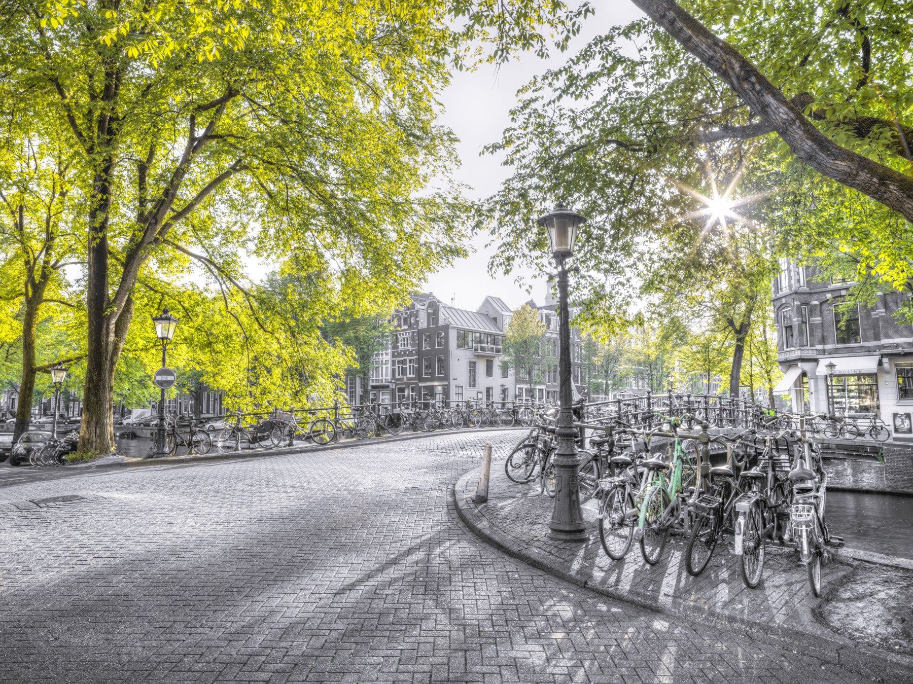 Dette fototapet viser et levende og kunstnerisk motiv af en gade i Amsterdam. Det unikke farvevalg med de muntre grønne træer mod et gråtonet bybillede bringer en frisk og moderne stemning til dit rum. Dette fototapet af høj kvalitet er perfekt til en stue, spisestue eller et stilfuldt kontor, og dette holdbare vægtapet er en enkel måde at få et unikt, kunstnerisk look, der føles både klassisk og moderne.