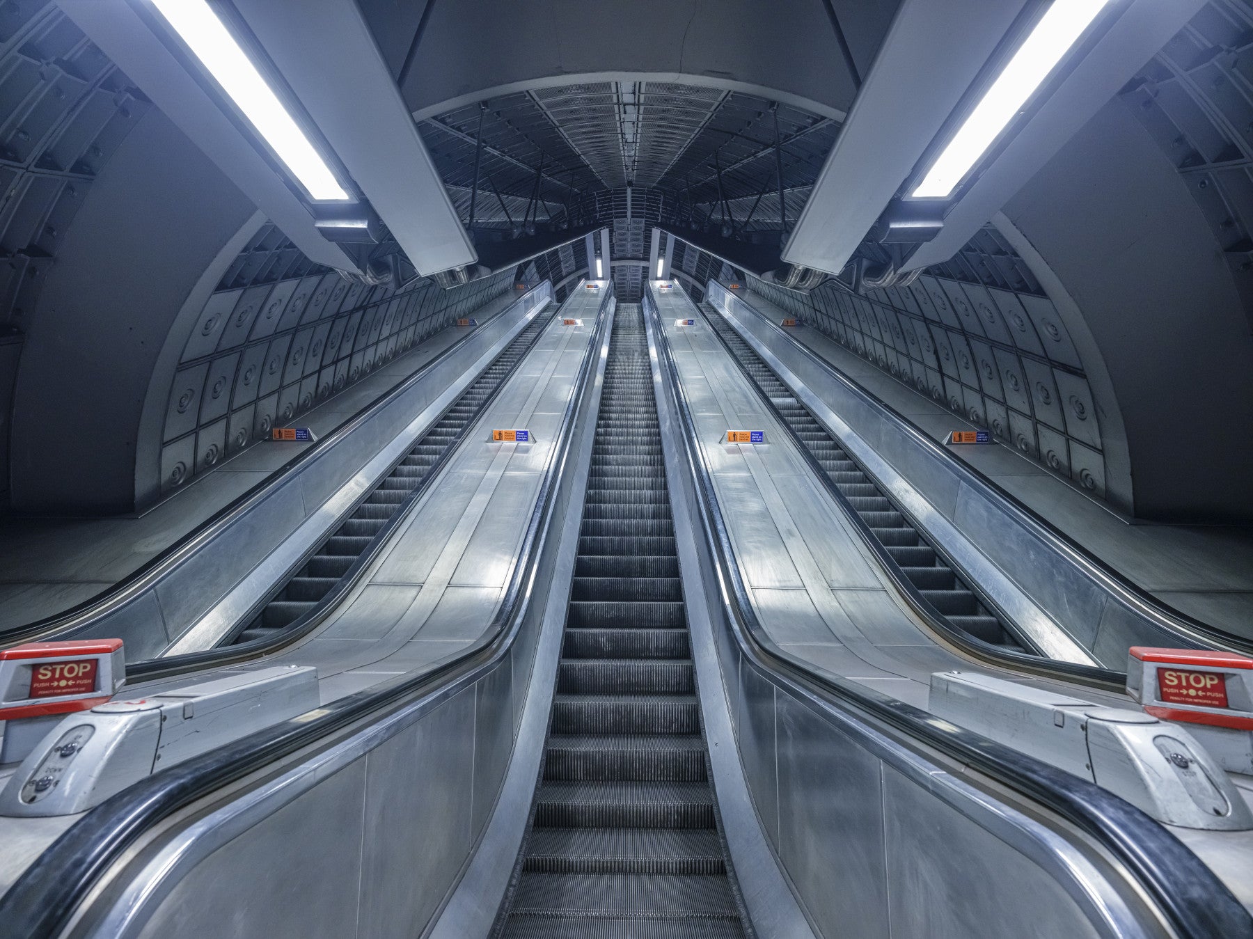 Escalator at subway station, London. Transform your room with this stunning perspective of a subway escalator. The composition draws your eyes up the converging lines, creating a sense of depth and height. The cool gray tones and stark lighting add a modern, industrial edge. This wallpaper for walls works well in hallways, home offices, or living rooms, bringing a touch of urban architecture to your space. The linear design complements minimalist and contemporary interiors.