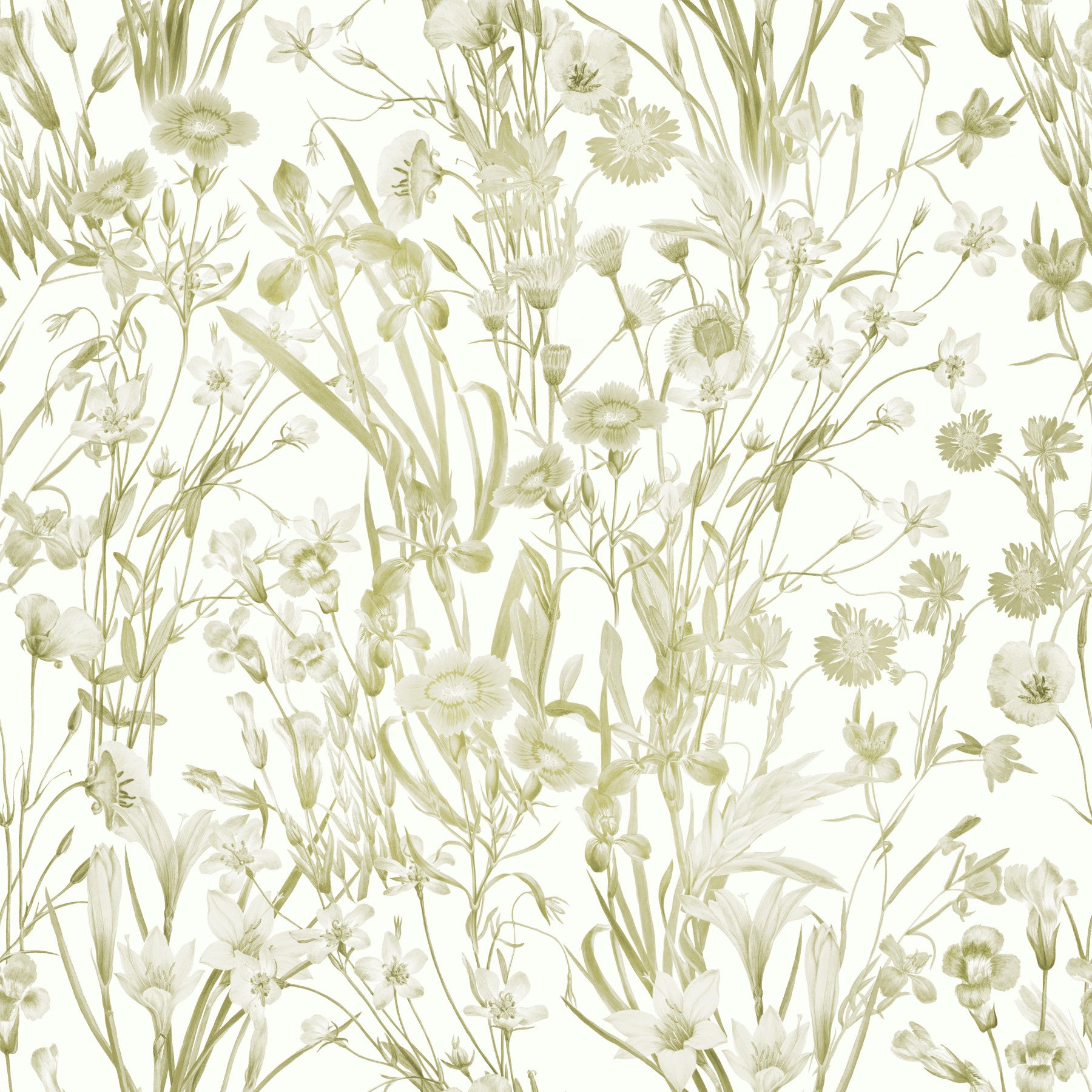 Embrace the tranquility of a sun-kissed meadow with this elegant floral wallpaper for walls. A muted olive-green palette sweeps across delicate watercolor wildflowers and grasses, creating a seamless, captivating design. It's well-suited for bedrooms, living rooms, or hallways, especially within Scandinavian, farmhouse, or cottage-style interiors. The design offers a calming backdrop that elevates the style of any space.