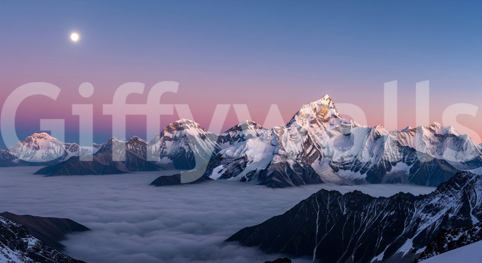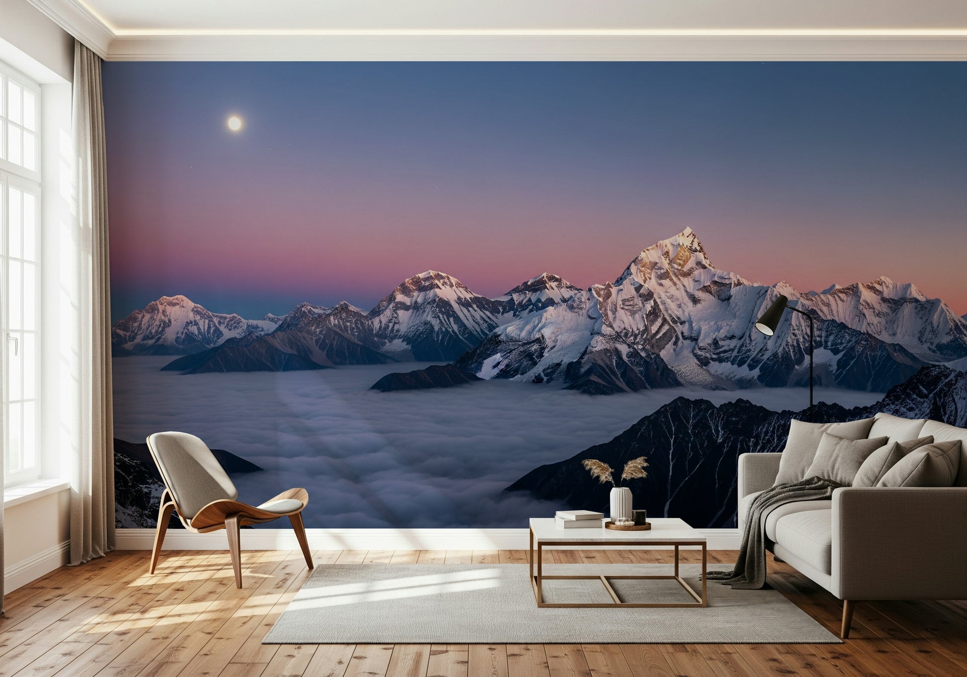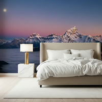 Elevate your space with a panoramic view of snow-laden peaks rising above a misty sea. The design uses a soft, gradient color palette blending hues of blue, pink, and white to evoke a sense of peace and tranquility. This majestic scene will transform your walls into a stunning focal point. Ideal for bedrooms, living spaces, or home offices, this wallpaper for walls invites the grandeur of nature indoors. The expansive vista complements interior spaces by creating a calming and sophisticated atmosphere, making any room a serene sanctuary.