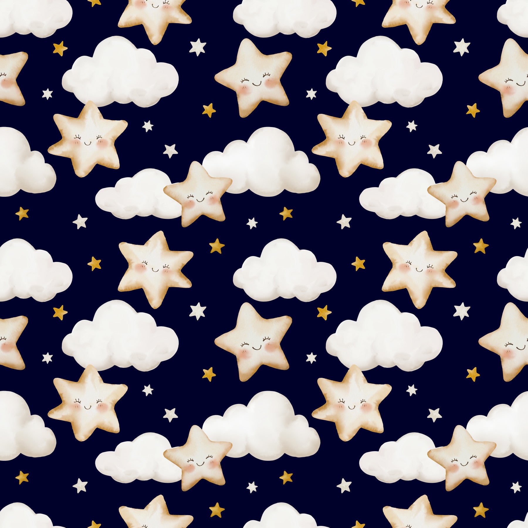 A navy wallpaper with repeating adorable stars and clouds creating a magical bedtime feel.