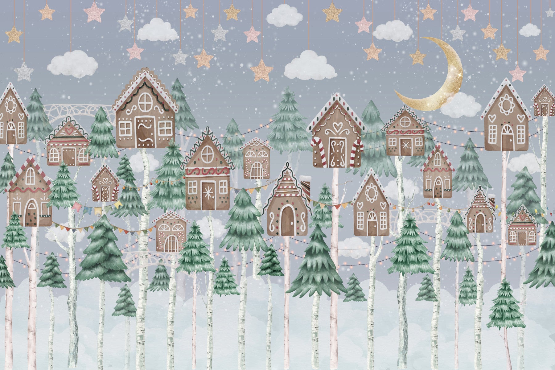 Bring festive charm to your home with this delightful design. Gingerbread houses hang among birch trees with sparkling lights, stars, and a crescent moon. The soft color palette will transform your space into a cozy, whimsical winter scene. Use this unique wallpaper for walls in bedrooms, nurseries, or playrooms. The playful design is sure to complement children rooms, farmhouse style, or winter cabin decors and add a touch of magic to your home.