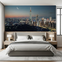 Løft dit hjem med en fascinerende udsigt over en blændende by i måneskinnet. Den detaljerede skyline, oplyst af utallige lys, bringer en imponerende urban atmosfære til dit interiør. Dette vægtapet skaber et sofistikeret udtryk i ethvert rum. Den beroligende farvepalet af blå, grå og diskrete orange farver fremmer en følelse af ro og dybde. Dette tapet fungerer vidunderligt i et soveværelse, en stue eller et arbejdsværelse og skaber en inspirerende og stilfuld baggrund. Se de livlige bylys forvandle dine vægge til en betagende scene.