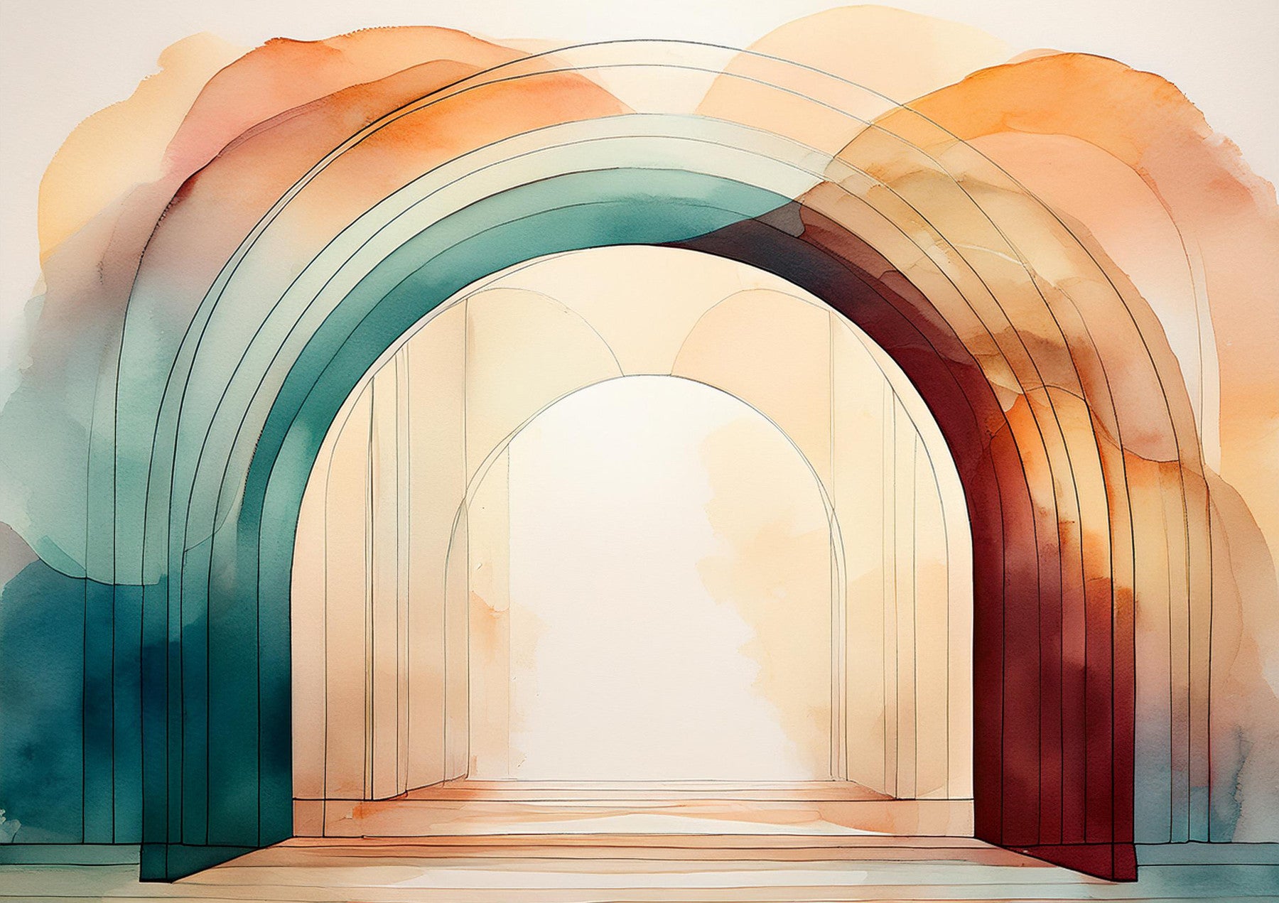 Et fantastisk abstrakt tapet med en akvarel gengivelse af arkitektoniske buer. Designet blander mesterligt organisk akvarelvask med præcise arkitektoniske linjer, hvilket skaber en unik visuel harmoni. Farvepaletten er rig, men alligevel dæmpet, der spænder fra dyb teal og bordeaux til blød beige og orange. De overlappende buer skaber en følelse af dybde og perspektiv og trækker seeren ind i den rolige scene. Dette stykke tilføjer et strejf af moderne elegance og sofistikeret ro til ethvert rum. Brugen af ​​akvarel giver en håndmalet, kunstnerisk kvalitet, hvilket gør det til et perfekt valg for dem, der søger unik og stilfuld vægindretning.