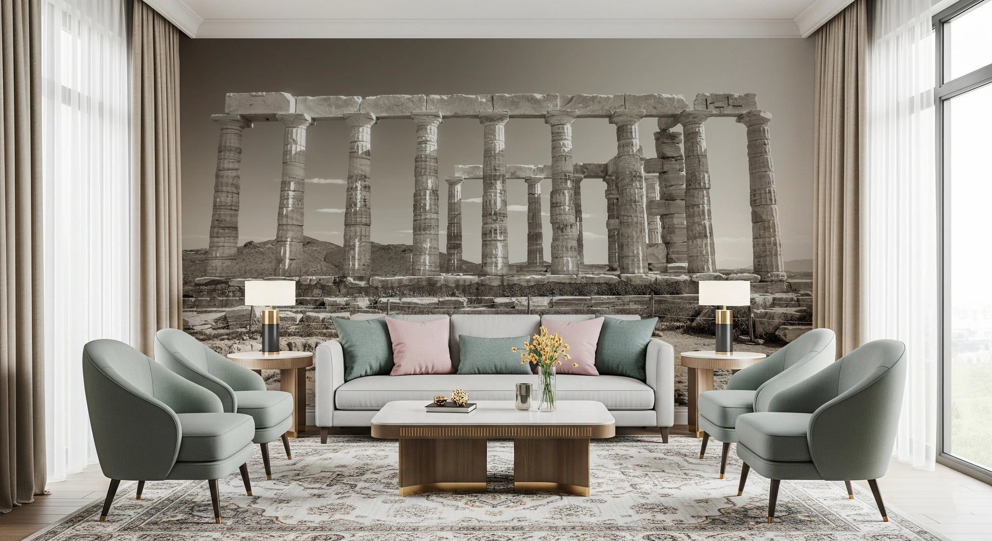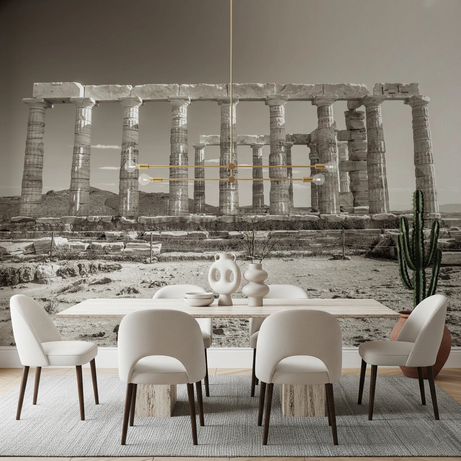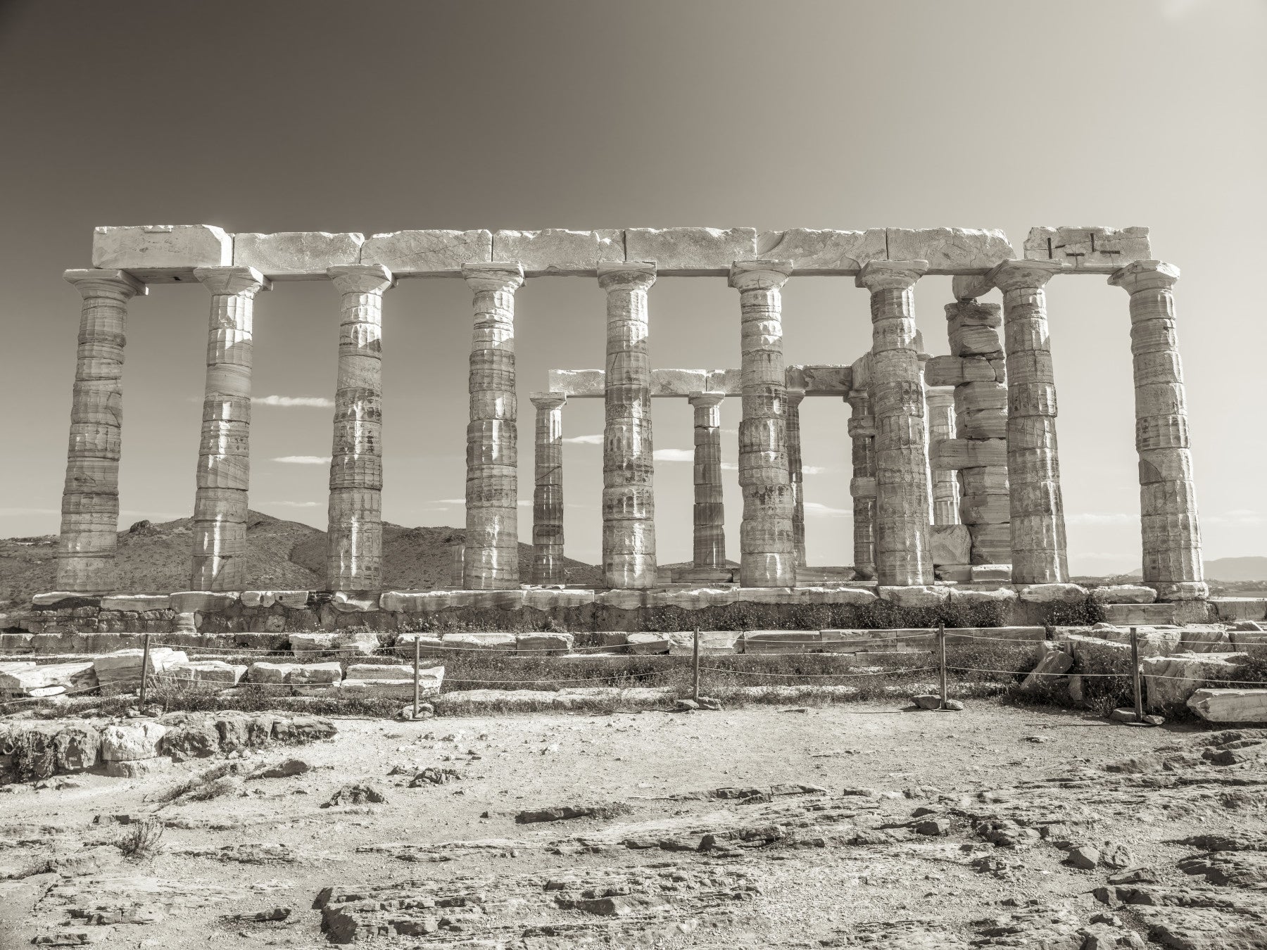 Fordyb dig i det antikke Grækenlands storhed med denne slående skildring af Poseidons Tempel. Denne vægdekoration indfanger den vedvarende ånd af klassisk arkitektur og fremviser de majestætiske søjler, der har bestået tidens tand. Den monokrome palet fremhæver scenens tidløse kvalitet og fremkalder en følelse af højtidelighed og ærbødighed. Bring et strejf af historisk elegance ind i dit rum, og lad den kraftfulde tilstedeværelse af Poseidons arv forvandle dine vægge. Tilføj en følelse af klassisk sofistikering og en følelse af vedvarende styrke til ethvert rum med denne stemningsfulde skildring af et gammelt vidunder.