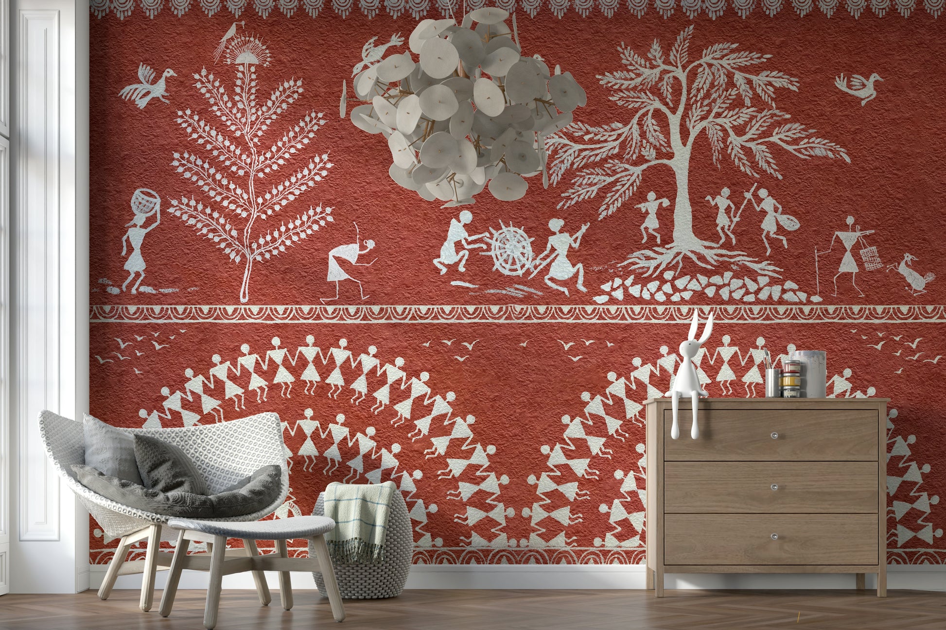 Imbue your interior with the rustic charm of tribal art using this terracotta and white wallpaper for walls. It evokes a sense of cultural heritage, making a striking statement in any room. Ideal for creating an accent wall in your study, a cozy atmosphere in your bedroom, or bringing a unique touch to your dining area, its warm color and minimalist design creates an inviting ambiance. This timeless design complements both modern and bohemian decor, adding depth and character to your space.