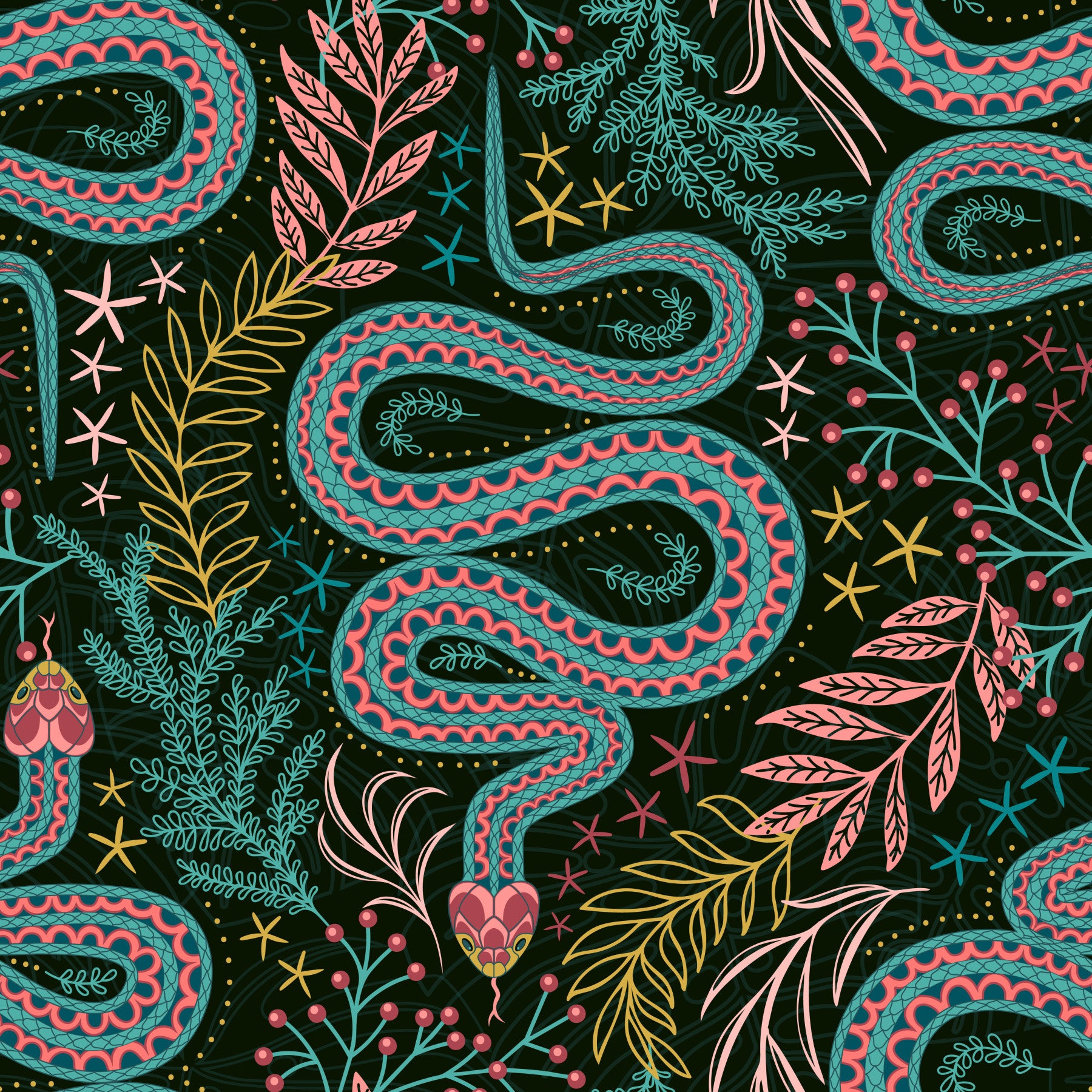 Omfavne tropens livlige energi med dette tapet med en stiliseret slange, der snoede sig gennem et frodigt landskab af eksotiske planter. Slangens teal og koralloner popper mod den dybe baggrund og skaber en slående visuel kontrast. Delikate lyserøde og guld accenter fremhæver de komplicerede detaljer og giver et strejf af elegance til dette legende design. Denne tapeters blanding af håndtegnet stil og eksotiske billeder bringer en livlig, energisk fornemmelse til ethvert rum, der tilfører det med magien i et tropisk paradis.