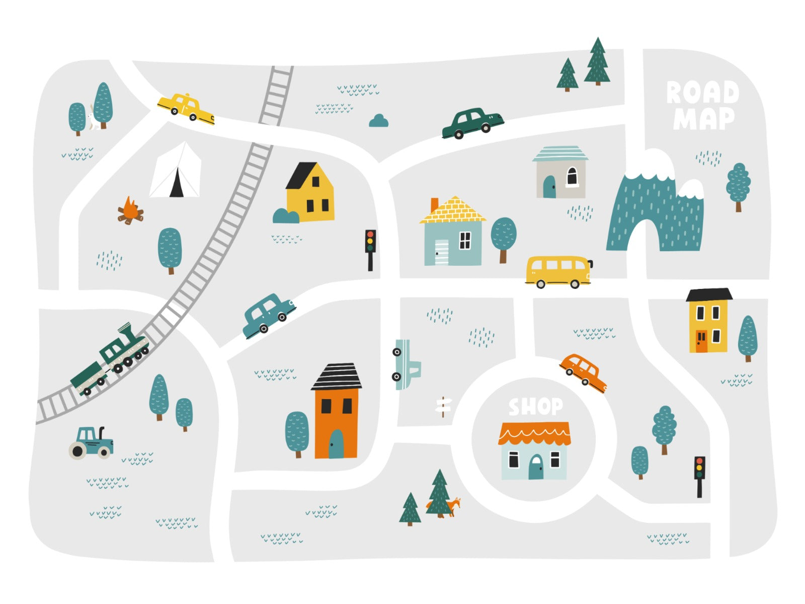 Playful town map wall mural wallpaper for kids' rooms.