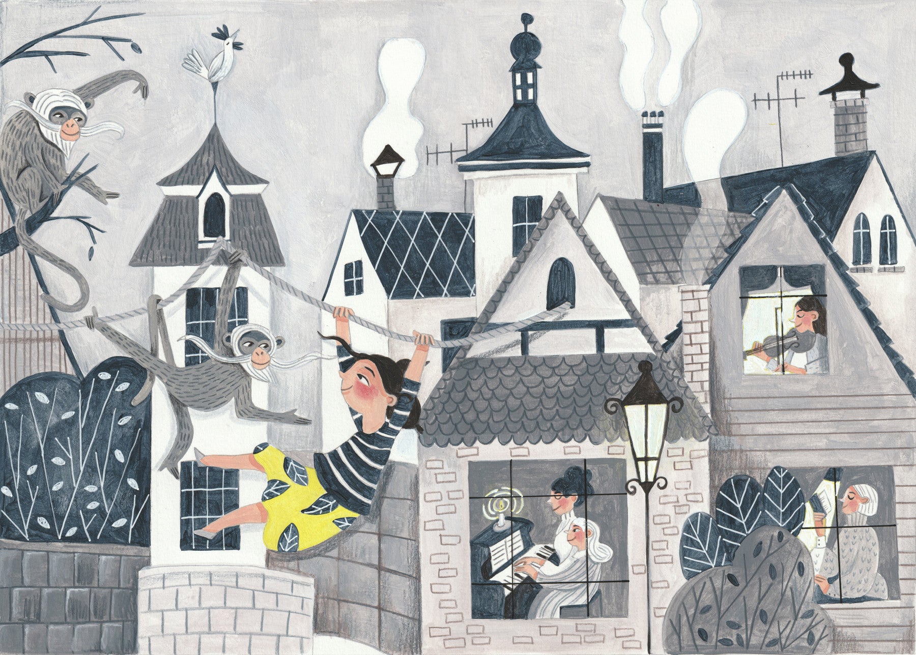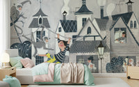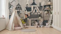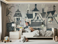 Bring a playful, creative spirit to your walls with this whimsical wallpaper for walls. Gray and yellow hues craft a scene where adventure meets quiet town life. Featuring swinging children and monkeys amongst whimsical houses, this design fosters joy and storytelling. Use it in a kids room, playroom, or nursery. Its unique design provides a fun, imaginative element, helping to create cozy and unique interiors.