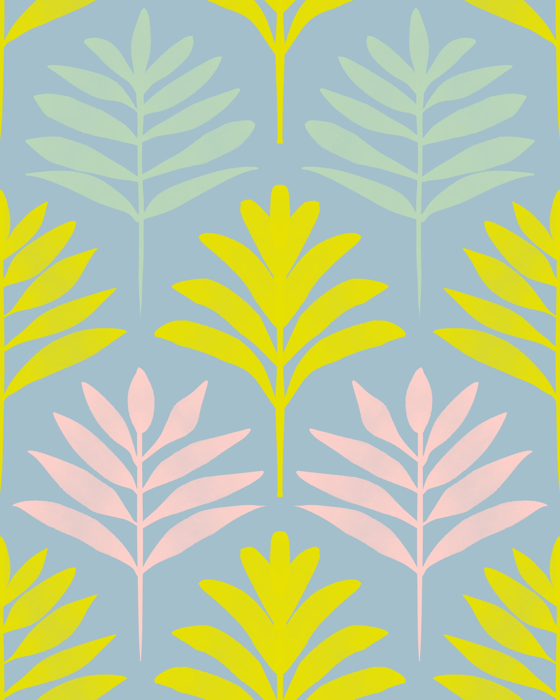 Undslippe til et roligt tropisk tilflugtssted med dette fantastiske tapet. Designet har et gentagende mønster af forenklede, stiliserede palmeblade i en blød farvepalet. Den beroligende blanding af lysegul, lysegrøn og rødme lyserød mod en dæmpet blå baggrund skaber en rolig atmosfære perfekt til afslapning. Dette minimalistiske, men alligevel udtryksfulde design er alsidigt nok til forskellige rum, herunder soveværelser, planteskoler, stuer eller endda gange, hvilket tilføjer et strejf af tropisk elegance uden at være overvældende. Dens subtile struktur og gentagne motiv skaber en harmonisk og fredelig atmosfære.